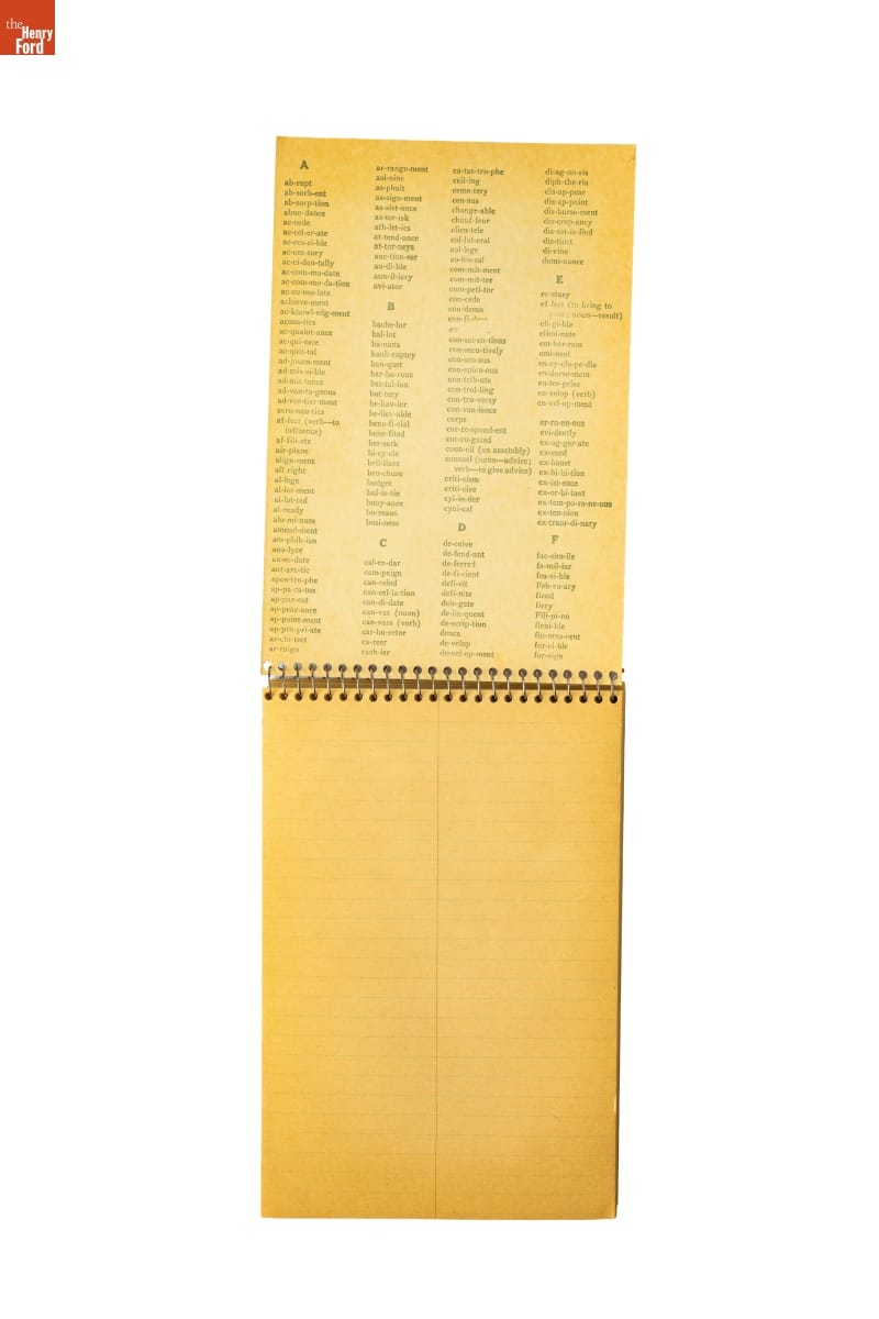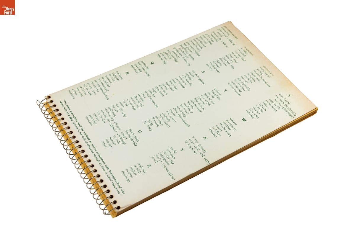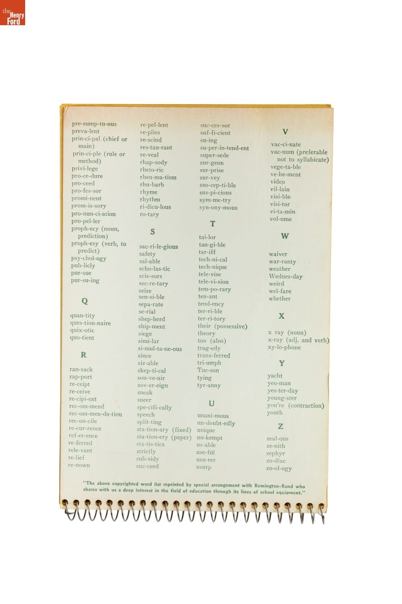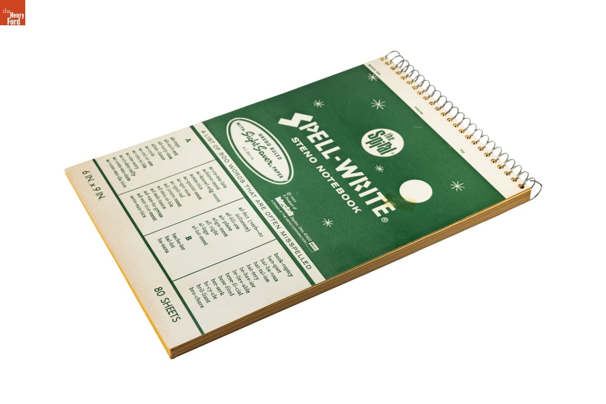 [...] / the / Spiral [R] / SPELL-WRITE / STENO NOTEBOOK / GREGG RULED / WITH Sight Saver [R] / PAPER / 43-8614 / [C] 1963 / A Product of / Westab Dayton, Ohio 45402 / A Division of THE MEAD CORPORATION / MEAD / A LIST OF 500 WORDS THAT ARE OFTEN MISSPELLED / [...] / 6 IN. X 9 IN. 80 SHEETS