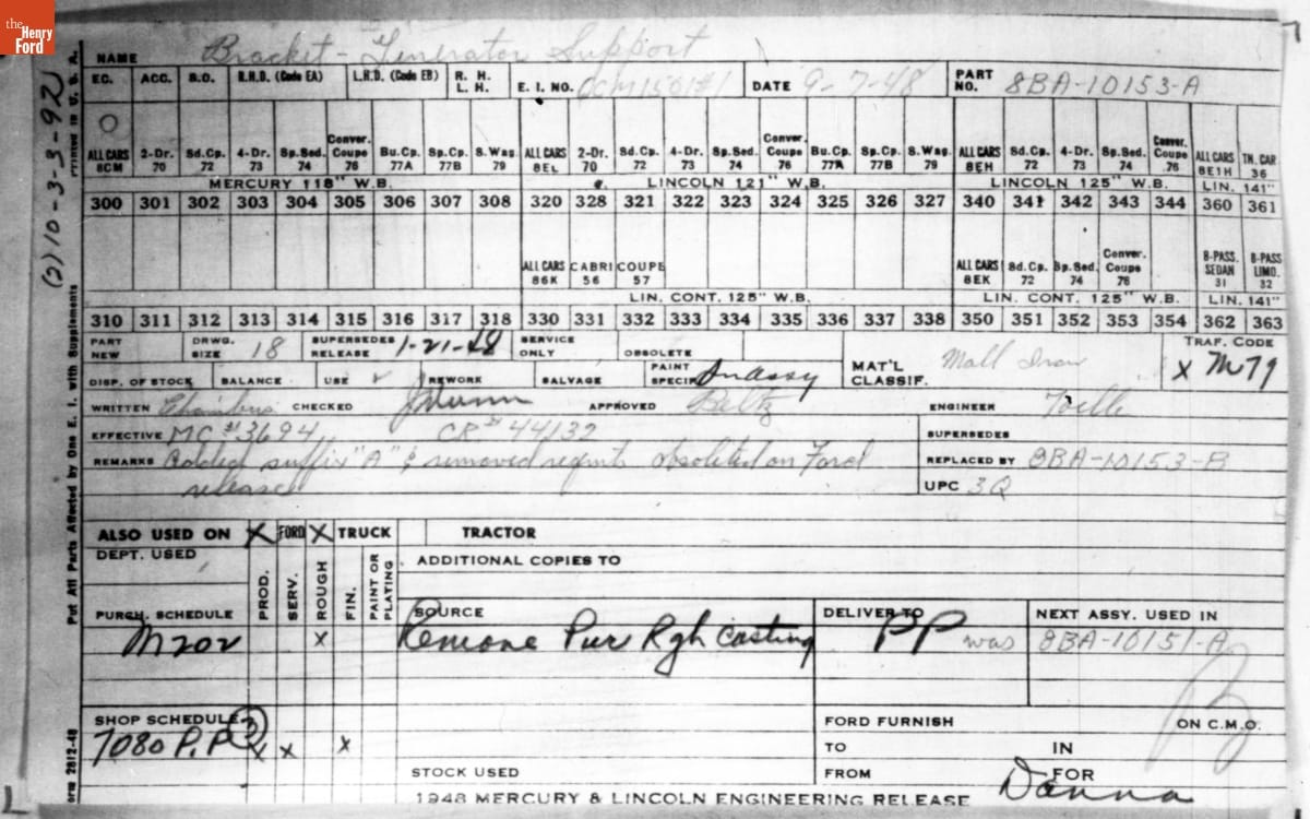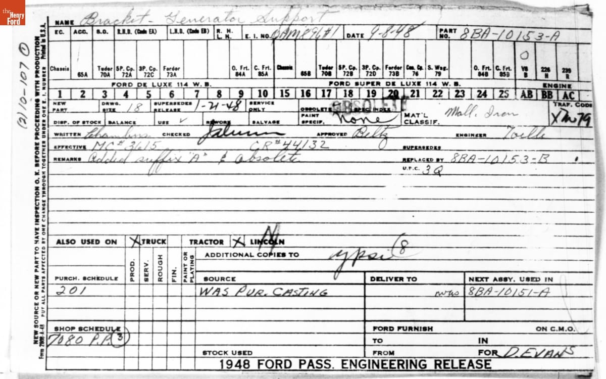 Engineering Release Notes, Bracket - Generator Support, Ford, Lincoln, and Mercury Automobiles, 1948