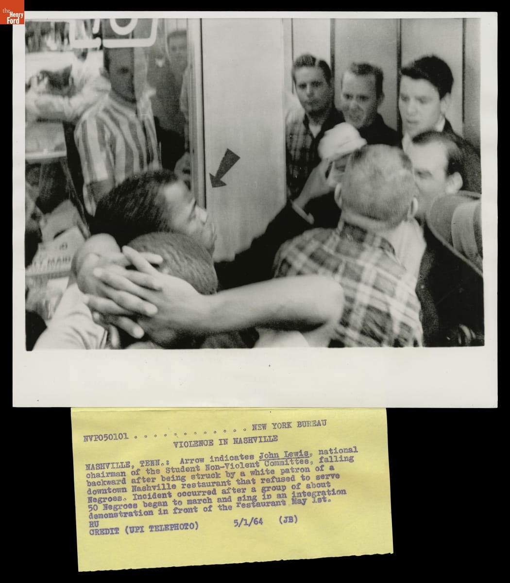 John Lewis Falls after Being Struck while Protesting at a Nashville Restaurant That Refused to Serve Blacks, May 1, 1964