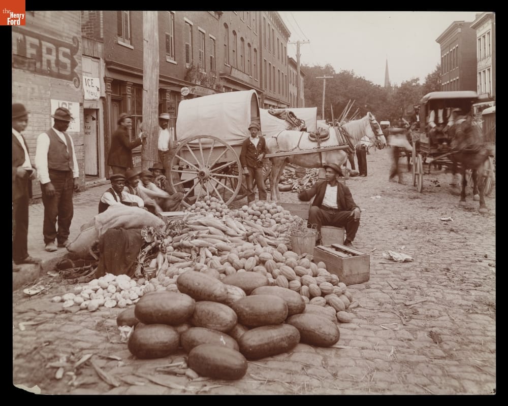 Farm families living on limited acreage near cities often hawked their vegetables and melons at local markets built to satisfy the public demand for food. These farmer entrepreneurs sold melons, squash, and sweetcorn near the Sixth Street Market in Richmond, Virginia. They used horse-drawn wagons or carts to transport their goods even as others adopted the automobile for transportation.