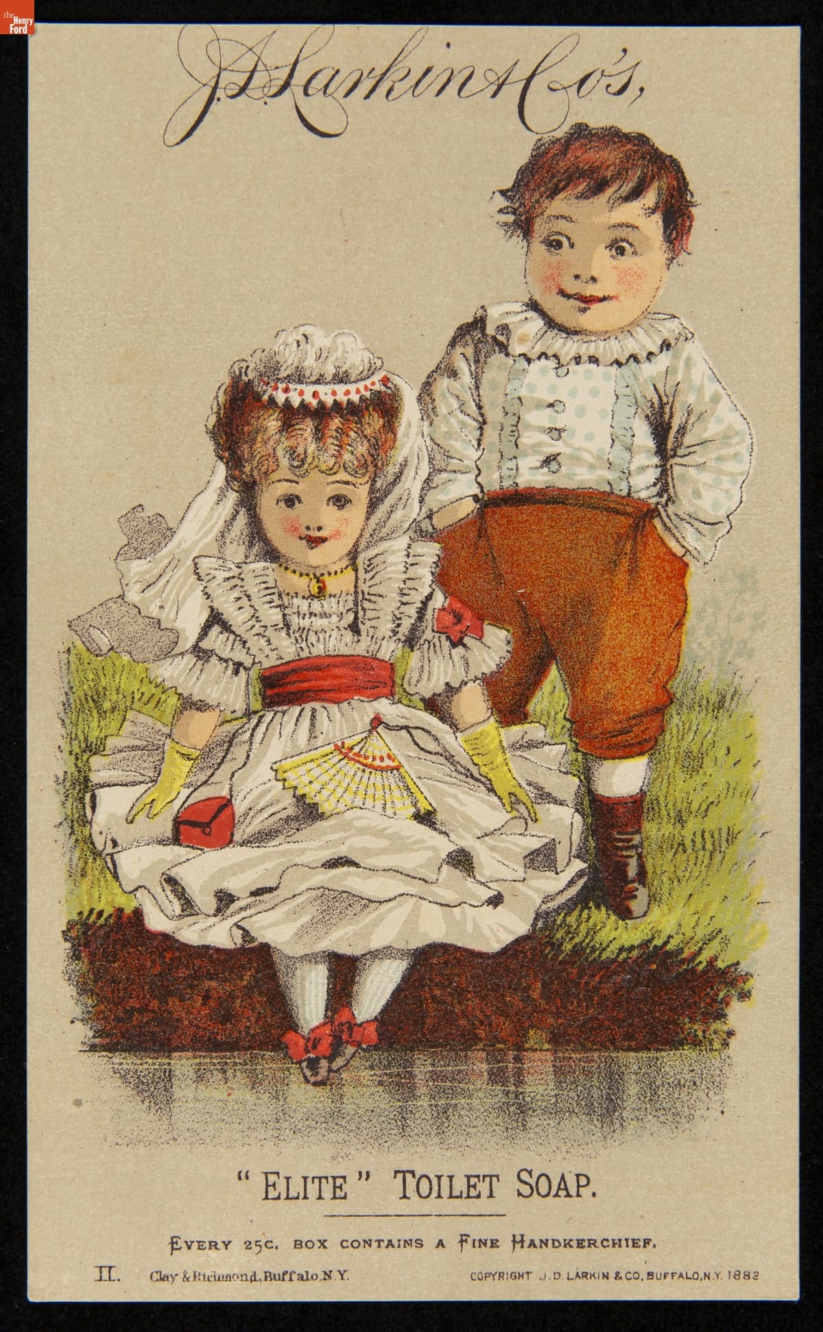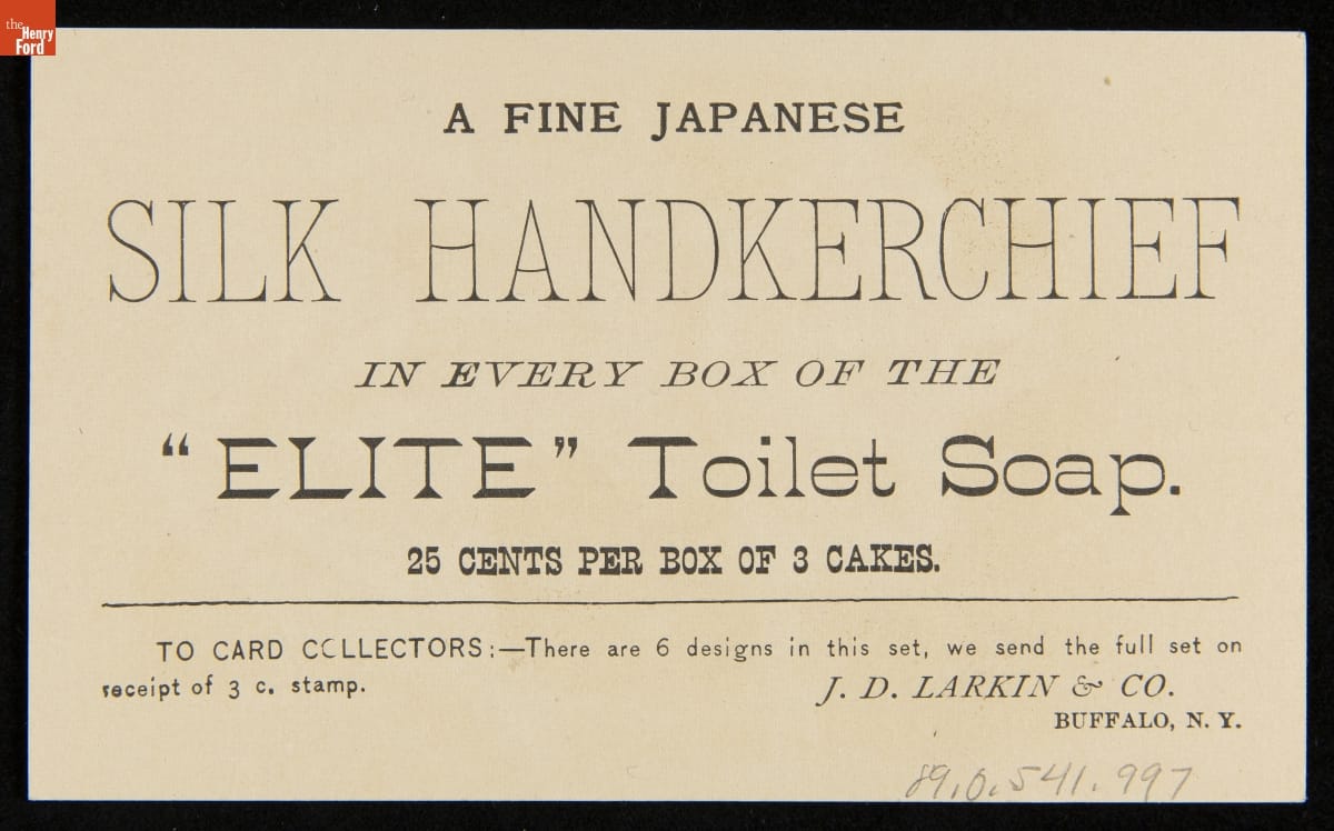 As color printing gained momentum in the late 19th century, advertisers bombarded potential customers with trade cards. Americans enjoyed and often saved the little advertisements found in product packages or distributed by local merchants. J.D. Larkin & Co.'s trade cards were known for promoting premium gifts with the purchase of a product. This card offers a silk handkerchief with the purchase of "Elite" toilet soap.
