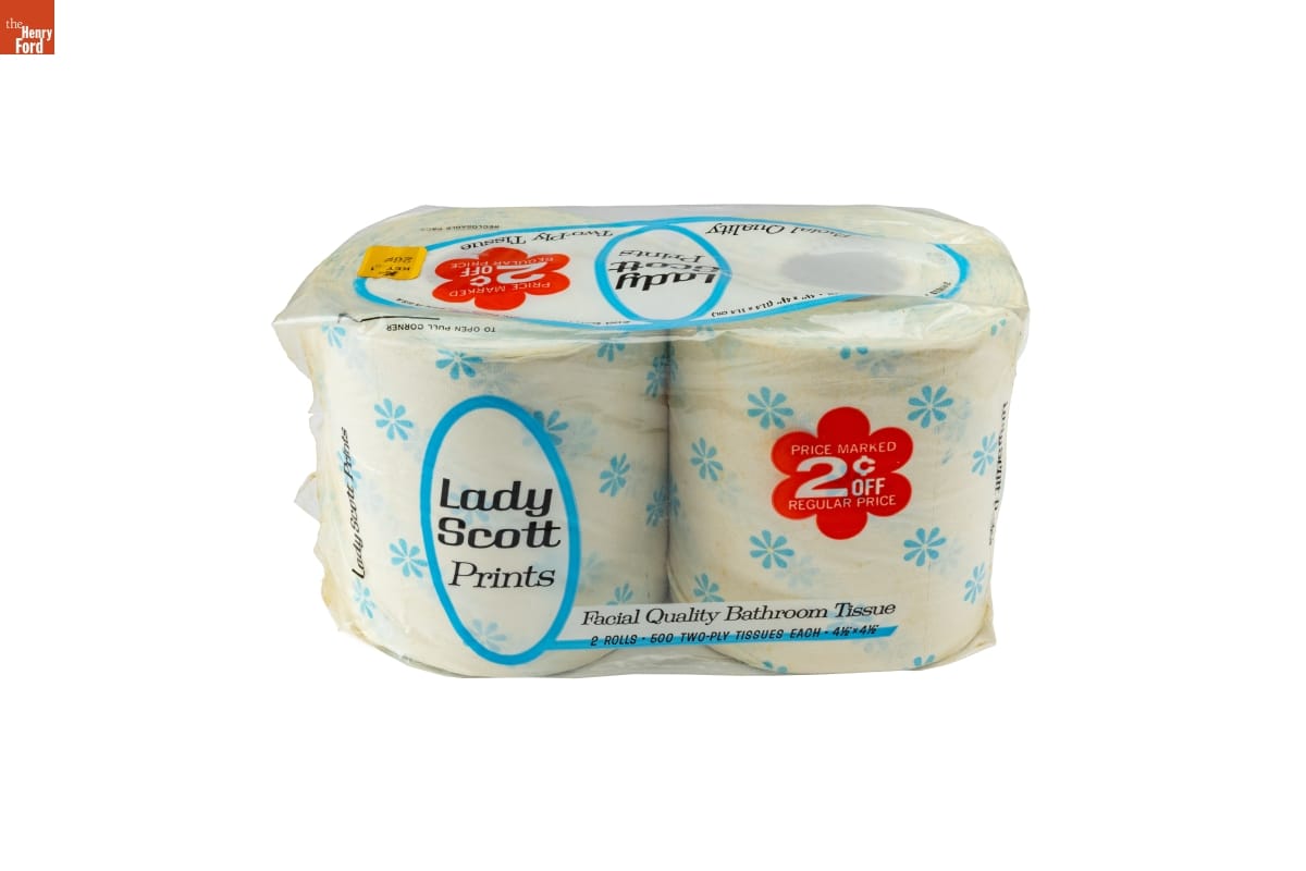 Lady / Scott / Prints / Facial Quality Bathroom Tissue / 2 ROLLS 500 TWO-PLY TISSUES EACH 4 1/2" X 4 1/2" / PRICE MARKED / 2 [cents symbol] / OFF / REGULAR PRICE