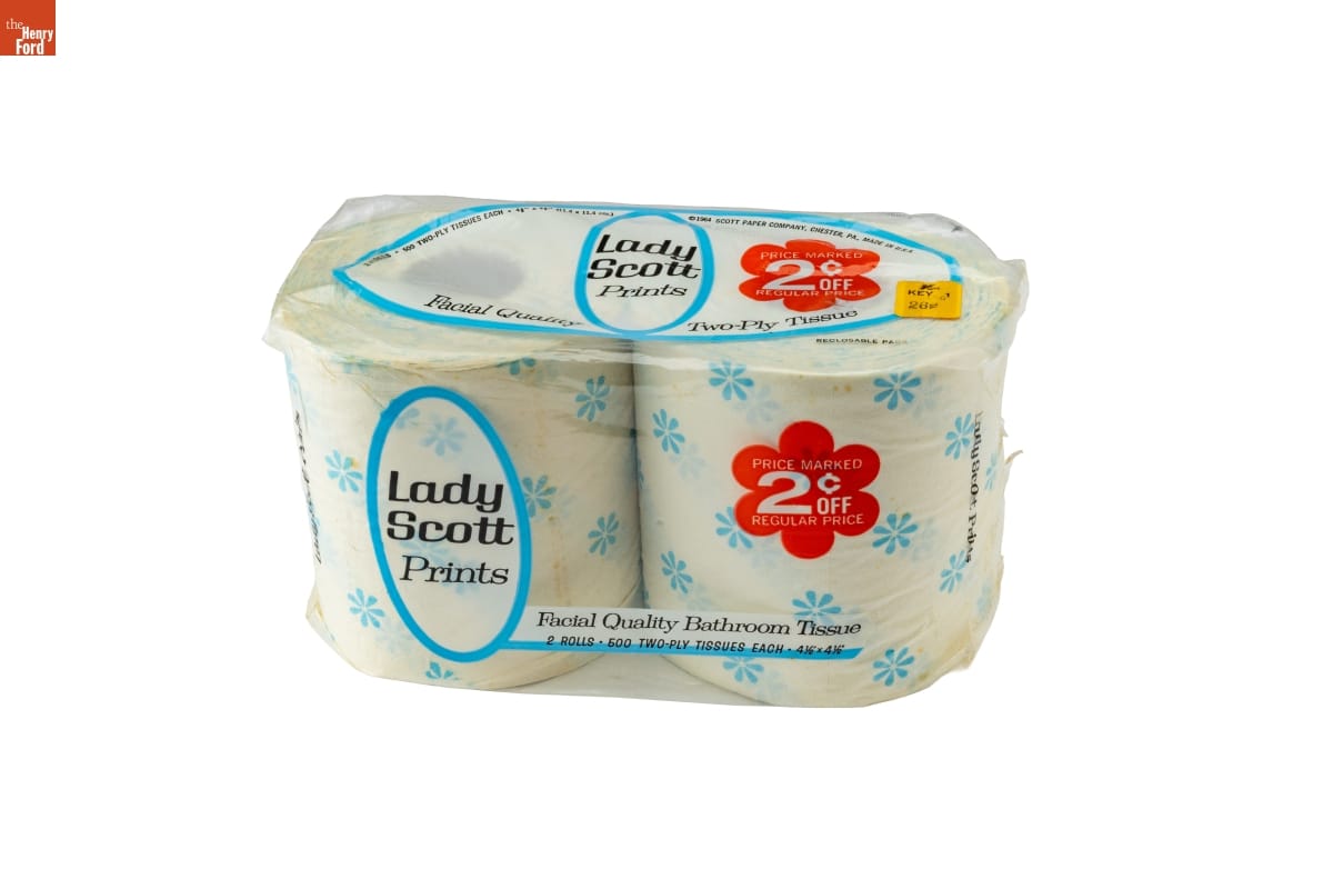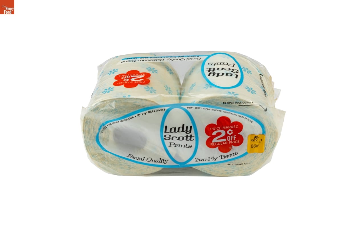 TO OPEN PULL CORNER / 2 ROLLS 500 TWO-PLY TISSUES [obscured] 4 1/2" X 4 1/2" (11.4 X 11.4 CM.) [C] 1964 SCOTT PAPER COMPANY, CHESTER, PA., MADE IN U.S.A. / Lady / Scott / Prints / PRICE MARKED / 2 [cents symbol] / OFF / REGULAR PRICE / Facial Quality Two-Ply Tissue / RECLOSABLE PACK