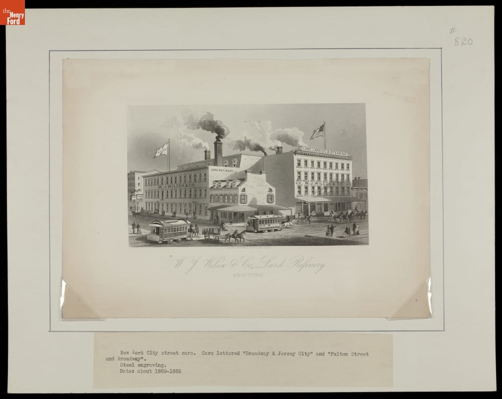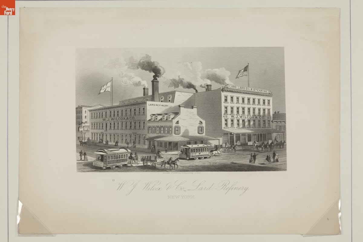 W. J. Wilcox and Company's refined lard (hog fat) and sent its products throughout the world. The company was one of the largest lard refiner and exporter in the late 1800s. The massive factory building and the bustling New York City street scene -- with a variety of transportation options -- depicted in this print conveys the company's commercial importance.