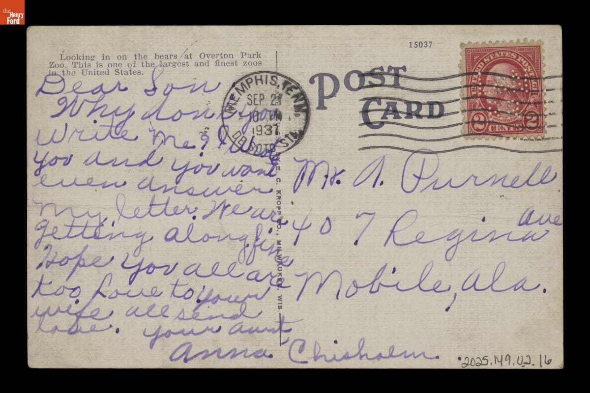 Andrew Purnell Jr. (1898-1975) was born in Selma, Alabama. He served in France during World War I and returned to the U.S. in 1919. Purnell married Lela May Cooper in 1920, and by 1926, the couple had moved to Mobile, where he worked as a railroad freight handler. The Purnells kept in touch with family and friends by exchanging postcards and letters.