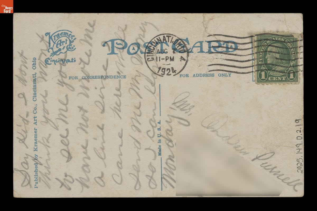 "General Hospital, Cincinnati, Ohio," Sent to Andrew Purnell, Postmarked August 7, 1924