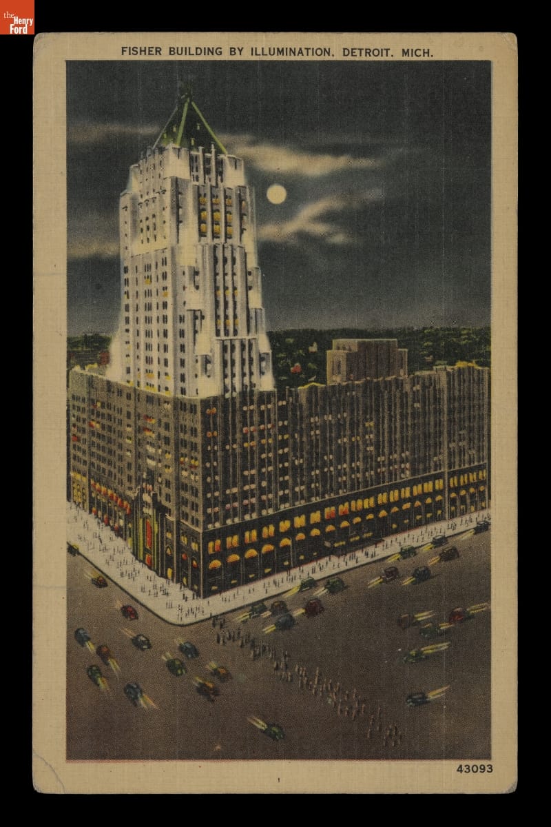"Fisher Building by Illumination, Detroit, Michigan," Sent to Andrew Purnell, Postmarked March 20, 1945