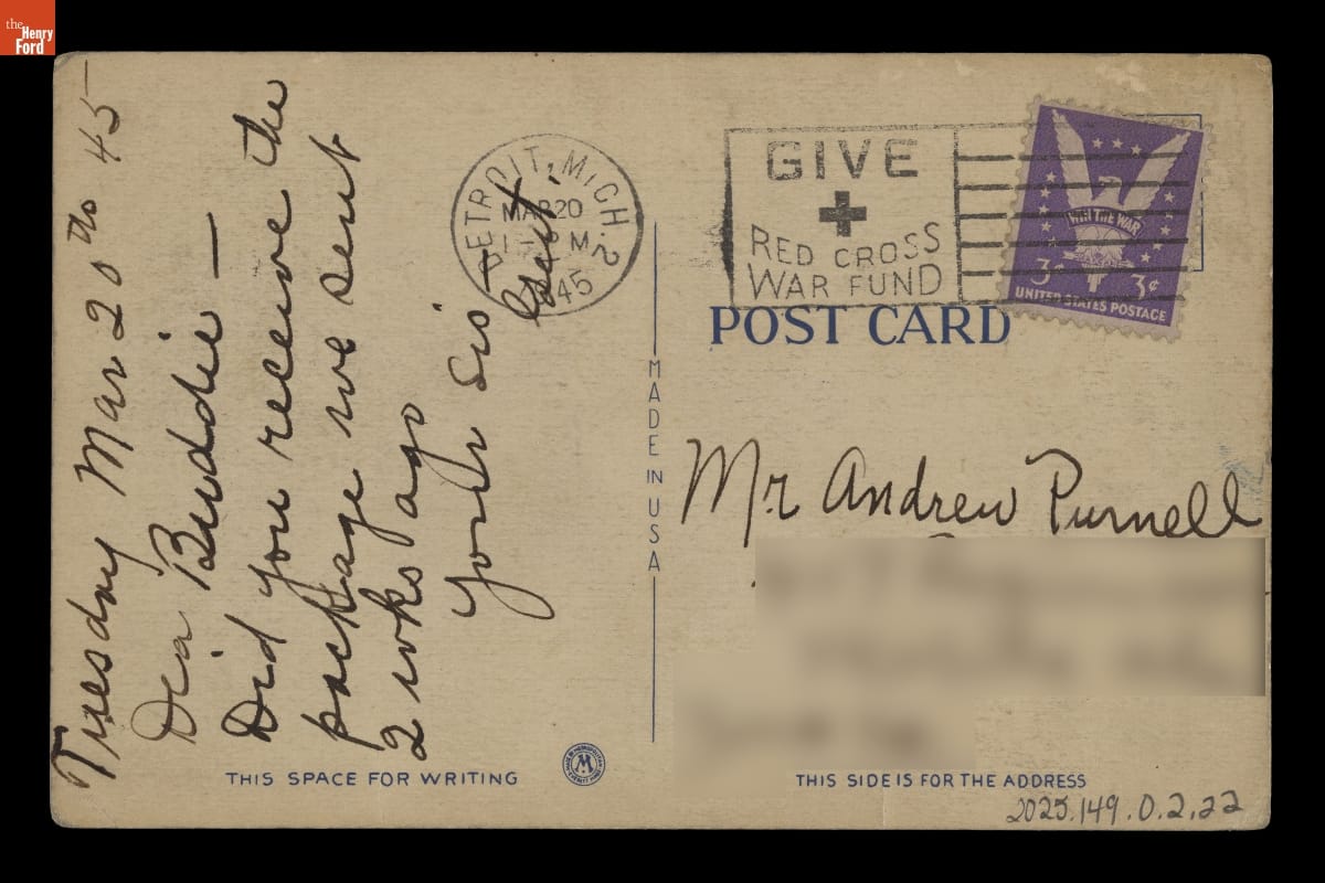 Andrew Purnell Jr. (1898-1975) was born in Selma, Alabama. He served in France during World War I and returned to the U.S. in 1919. Purnell married Lela May Cooper in 1920, and by 1926, the couple had moved to Mobile, where he worked as a railroad freight handler. The Purnells kept in touch with family and friends by exchanging postcards and letters.