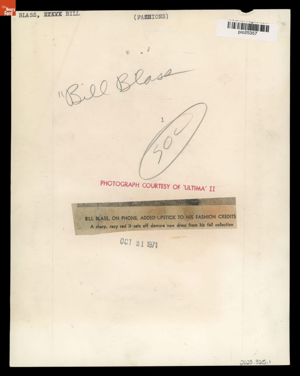 "Bill Blass, on Phone, Added Lipstick to His Fashion Credits," 1971