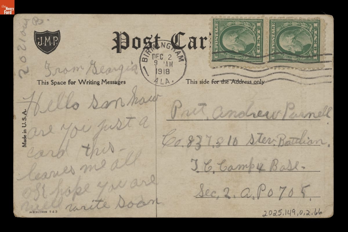 Andrew Purnell Jr. (1898-1975) was born in Selma, Alabama. He joined the all-Black 303rd Stevedore Regiment (with later unit designations) in December 1917. Private Purnell was stationed in Bordeaux, France. He returned to the U.S. in 1919, married, and worked as a railroad freight handler. Like many service members, Purnell kept cards, letters, photographs, and souvenirs from his time in the military.