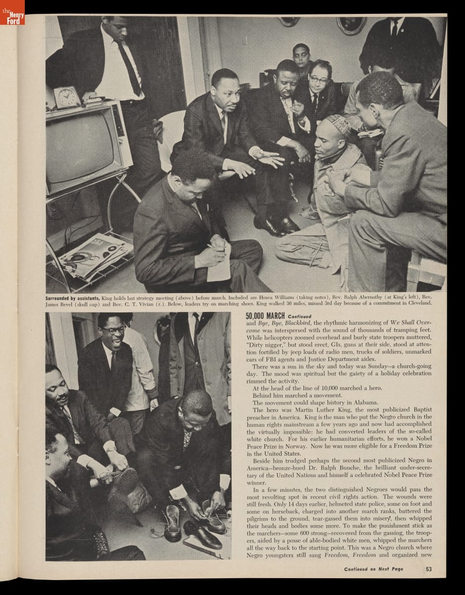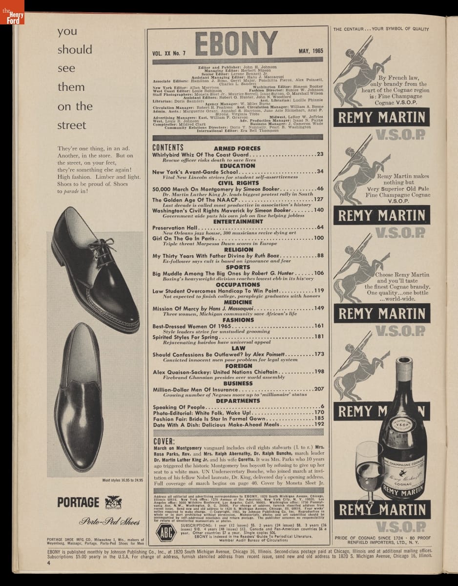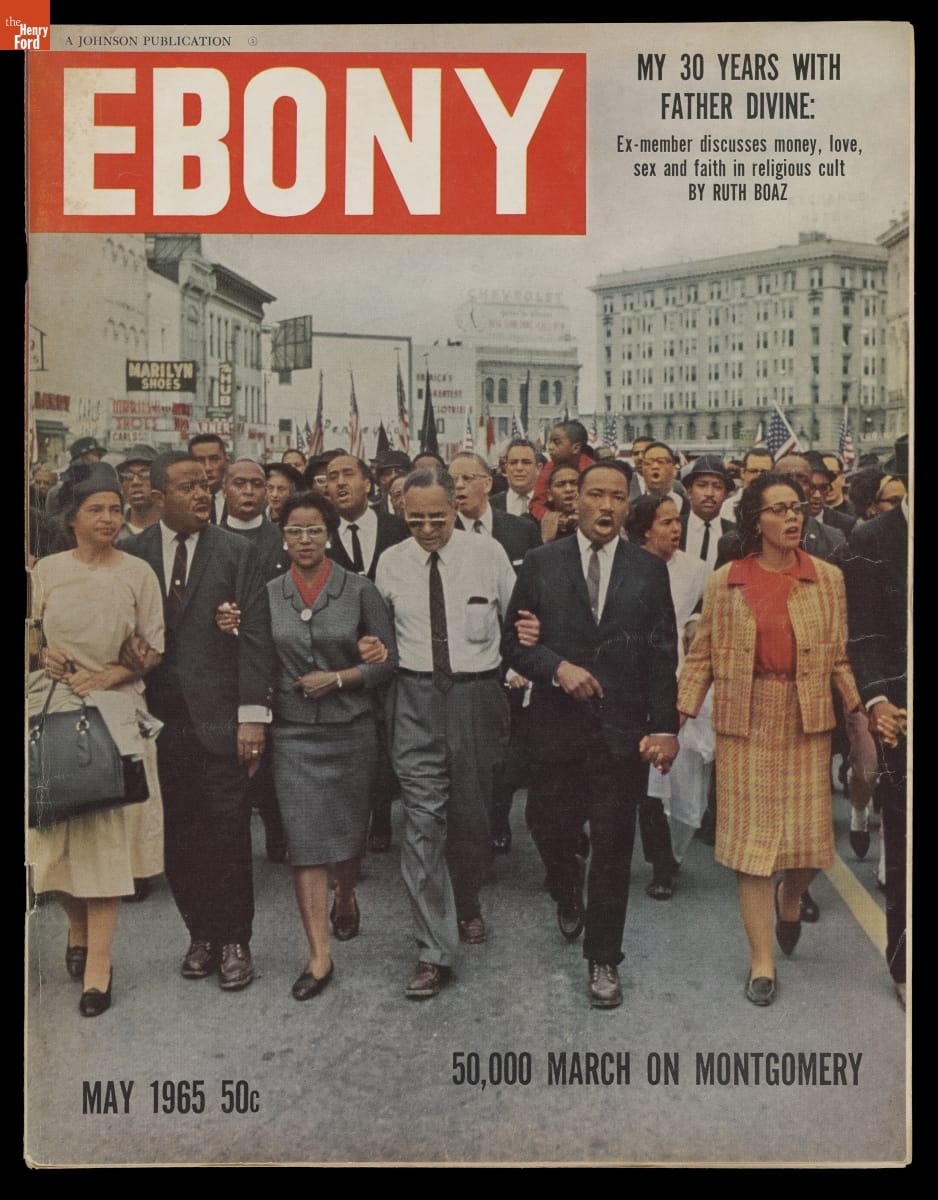Since 1945, Ebony has focused upon issues, personalities, and interests geared to the African-American market. During the civil rights era of the 1950s and 60s, the magazine regularly kept Americans apprised of the movement for equality. This cover features the 1965 March on Montgomery. This nonviolent demonstration helped secure voting rights legislation for all American citizens.