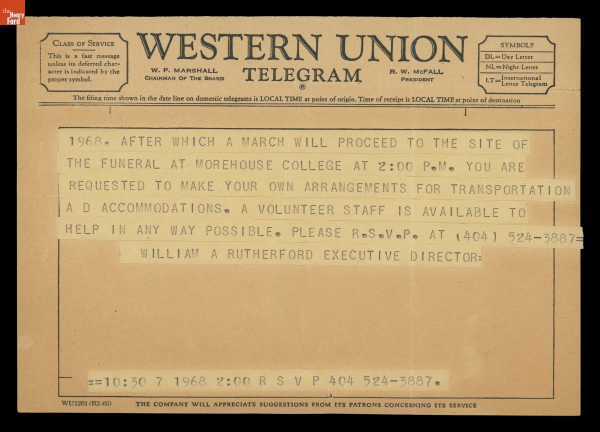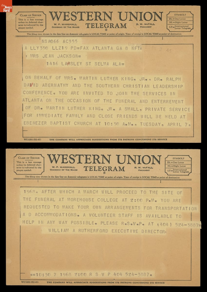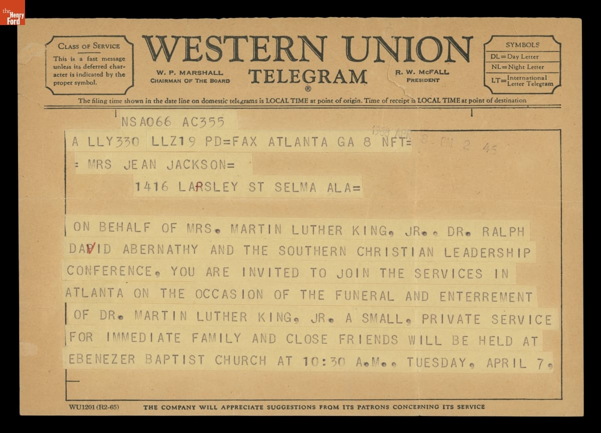Telegram Inviting Richie Jean Jackson to the Funeral of Martin Luther King Jr.