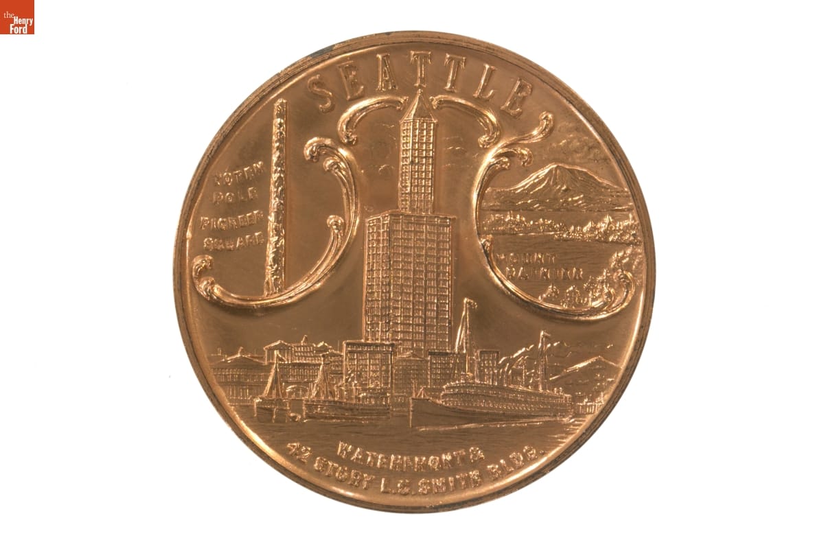 Some tourist attractions created "lucky pennies" for visitors as a reminder of their travels. This souvenir from Seattle, Washington, depicts a Native American on the front and local attractions on the back. One attraction is the Memorial Pole in Pioneer Park. Seattle businessmen took the pole from a Tlingit village in Alaska in 1899 and were later fined for theft. Though controversial, it became a city landmark.