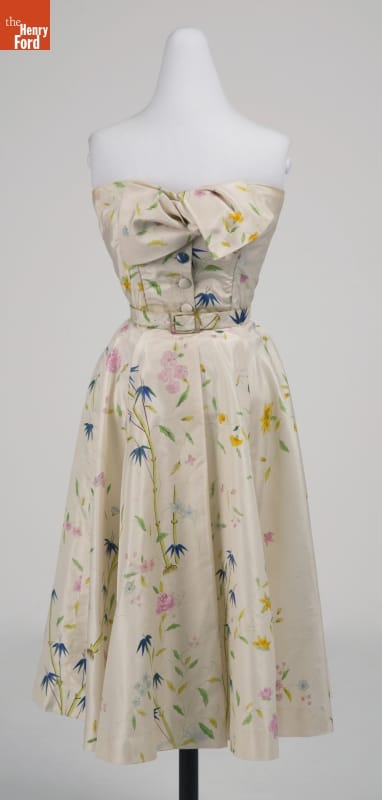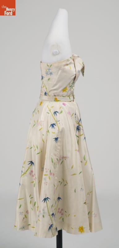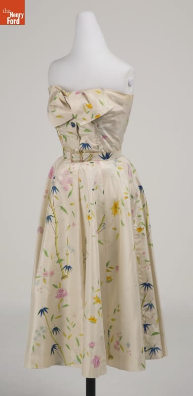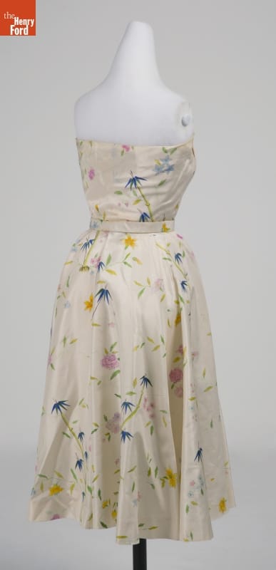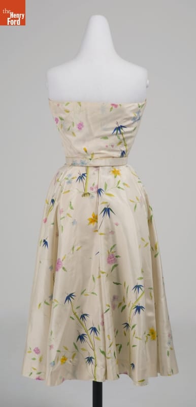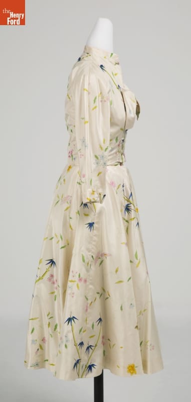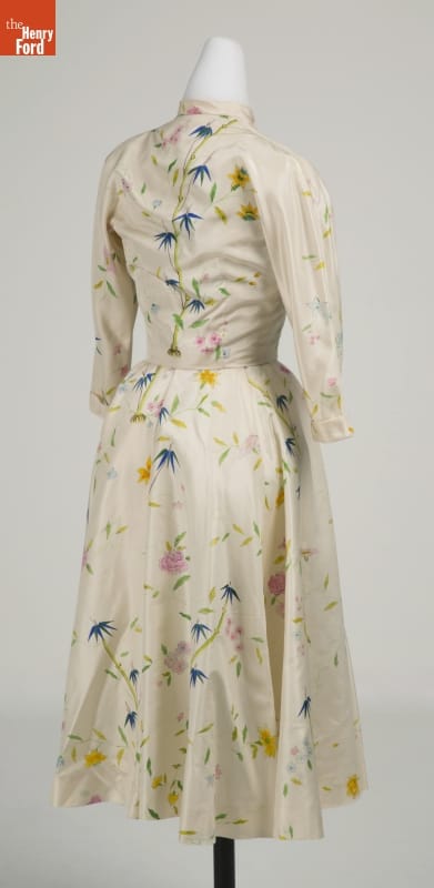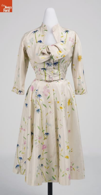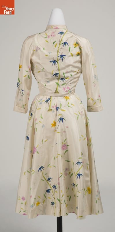 The fabric used in this mid-1950s dress recalls the influence of Chinoiserie -- fanciful European interpretations of Chinese motifs and styles popular during the 17th and 18th centuries. The fabric's floral design is reminiscent of late 18th-century hand-painted Chinese export fabric. Parisian couturier Cristobal Balenciaga made this ensemble for Elizabeth Parke Firestone, wife of tire magnate Harvey S. Firestone, Jr.
