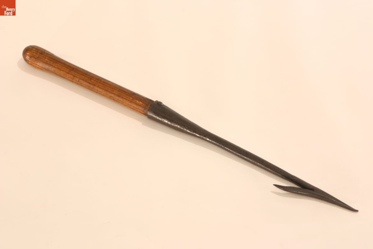 Loose hay becomes compressed over time when stored in stacks or in a barn's haymow. Nineteenth-century farmers used this harpoon-like tool to open up this compacted material and access the nutritious livestock feed.