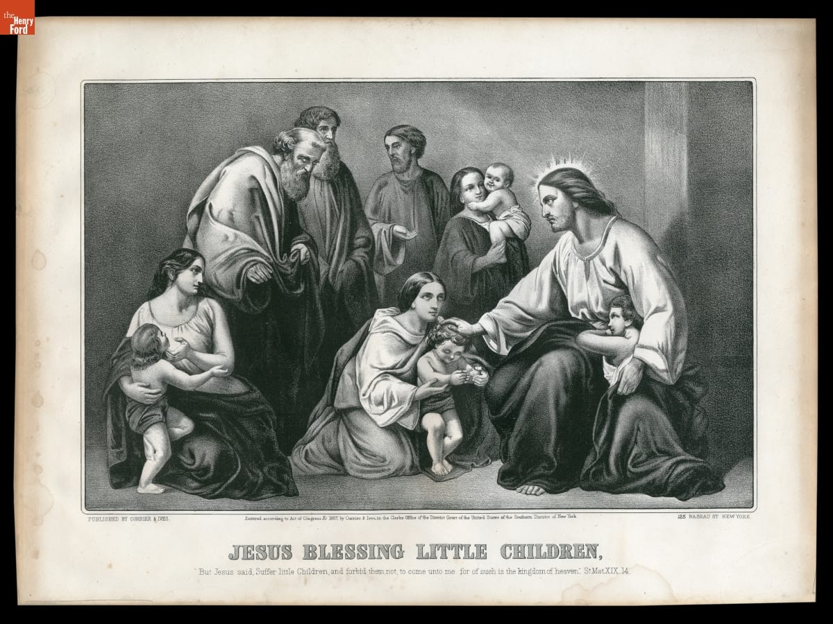PUBLISHED BY CURRIER & IVES [...] 125 NASSAU ST., N.Y. / JESUS BLESSING LITTLE CHILDREN / But, Jesus said, Suffer Little Children, and forbid them not to come unto me for of such is the kingdom of Heaven. St Matt XIX.