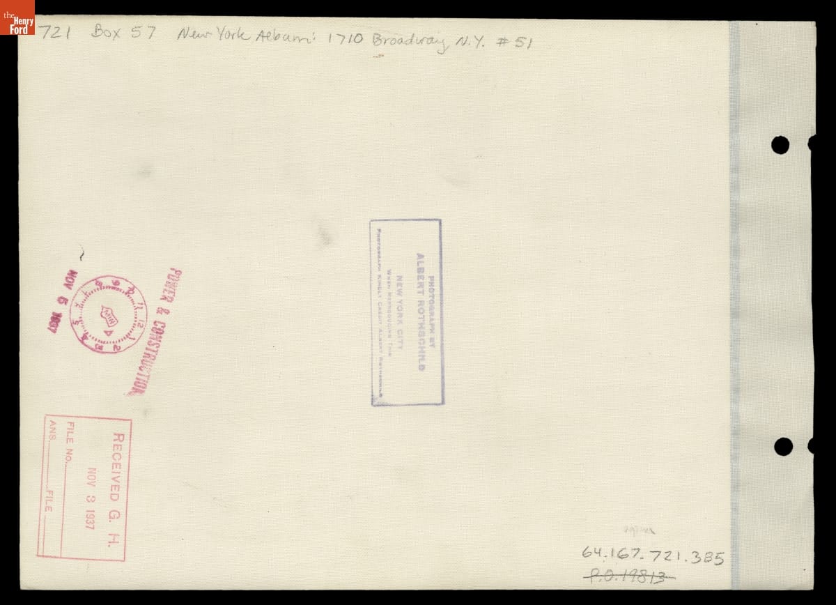 Ford Motor Company operated sales and service branches throughout the United States -- and ultimately around the world. Architect Albert Kahn designed this building for Ford's showroom, parts department, and offices on Broadway in New York City. It opened in 1919, and it was thoroughly remodeled in 1937. Ford sold the building to the International Ladies' Garment Workers' Union in 1943.