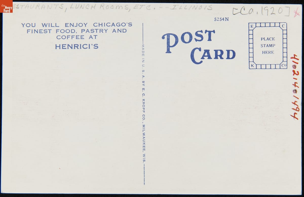 Henrici's, 67-71 W. Randolph Street, "Chicago's Most Famous Restaurant," circa 1920