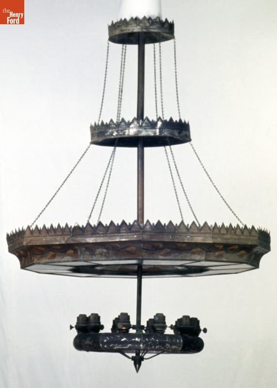 Stores, depots, theaters, churches, libraries and other public buildings in the late 19th century required areas of concentrated light. Large overhead chandeliers with multiple burners and mirrored reflectors illuminated a building's dark spaces. This chandelier's large ring of mirrors on the underside of the lower canopy reflected light from ten kerosene burners down onto the public space below.
