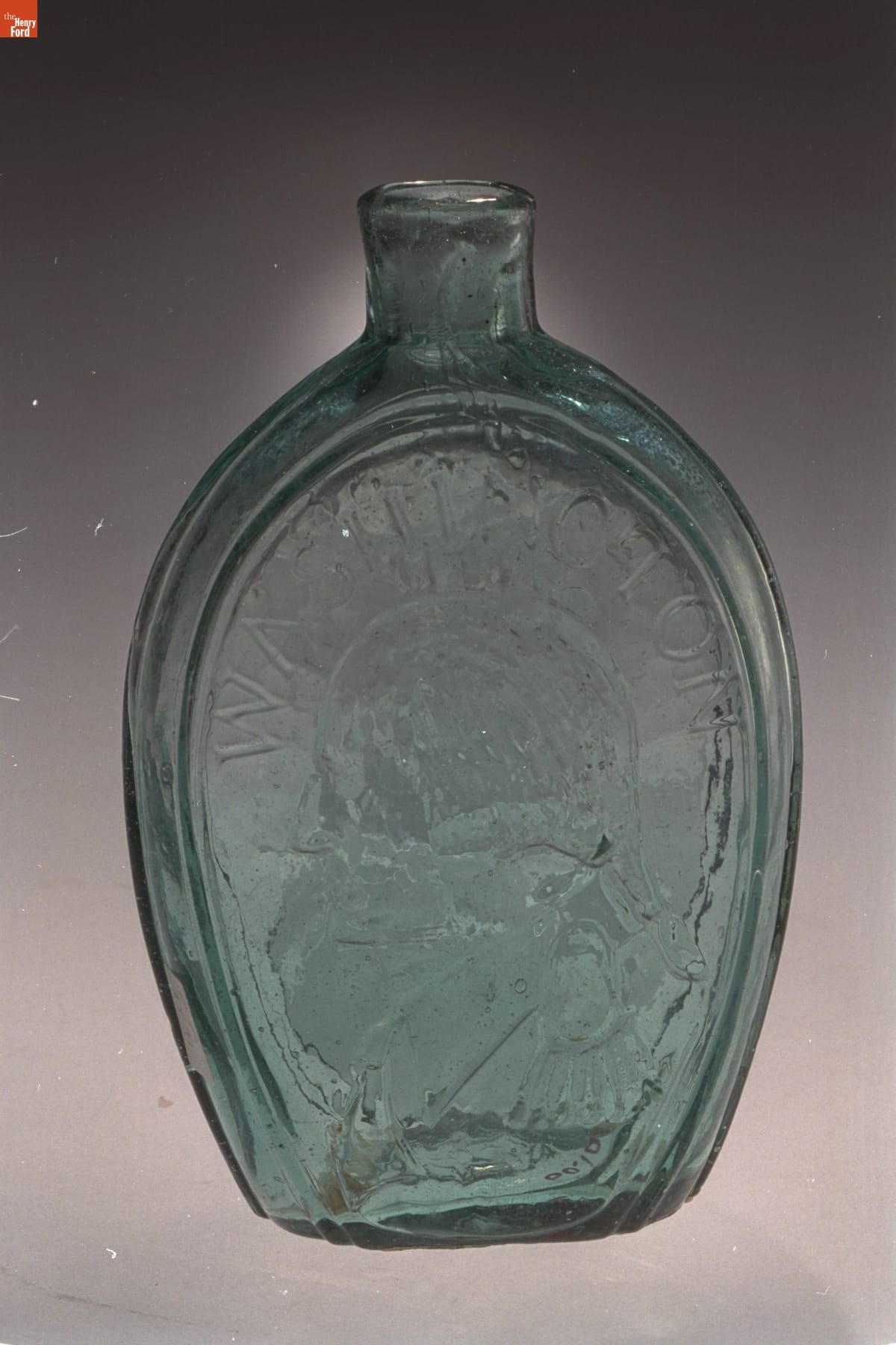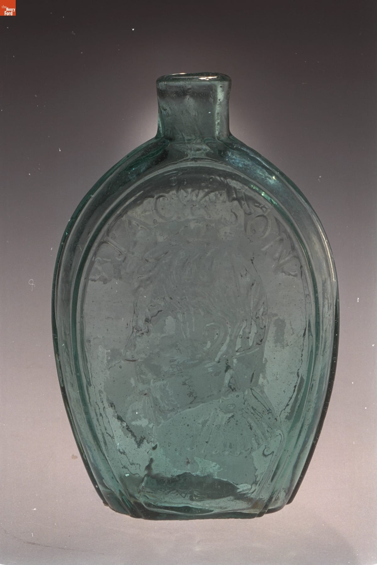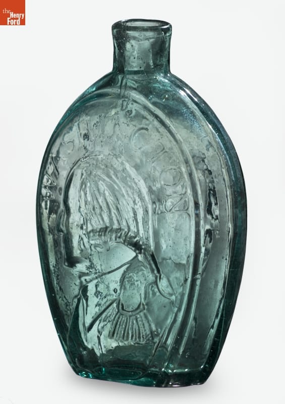 Whether depicted as commander-in-chief of the Continental Army or the first president of the United States, George Washington is a common likeness on early American flasks. Washington appears on 72 recorded flask designs--more than any other person. This example depicts Washington and later president Andrew Jackson in military uniform.