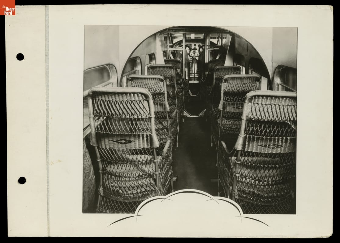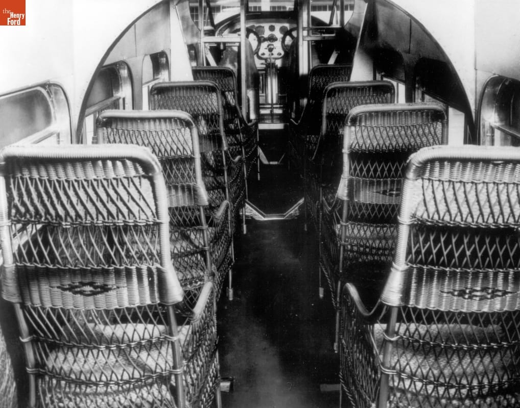 The interior of a Ford Tri-Motor airplane is seen in this 1928 view. Lightweight wicker seats were provided for passengers. The less the airplane itself weighed, the more passengers or cargo it could carry.