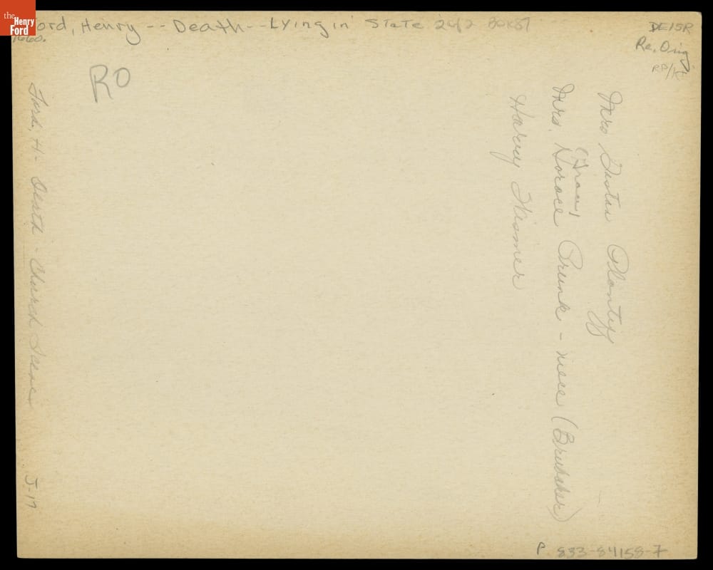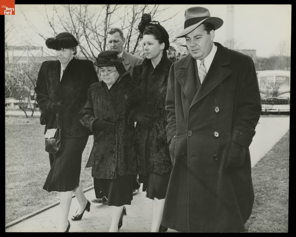 Henry Ford died on April 7, 1947, at Fair Lane, his estate in Dearborn, Michigan. Thousands mourned the death of this American industrialist and founder of Ford Motor Company. Many came to pay their respects when Ford lay in repose at Greenfield Village. This photo shows Clara Bryant Ford, Henry's wife, with other Bryant family members arriving at Greenfield Village.