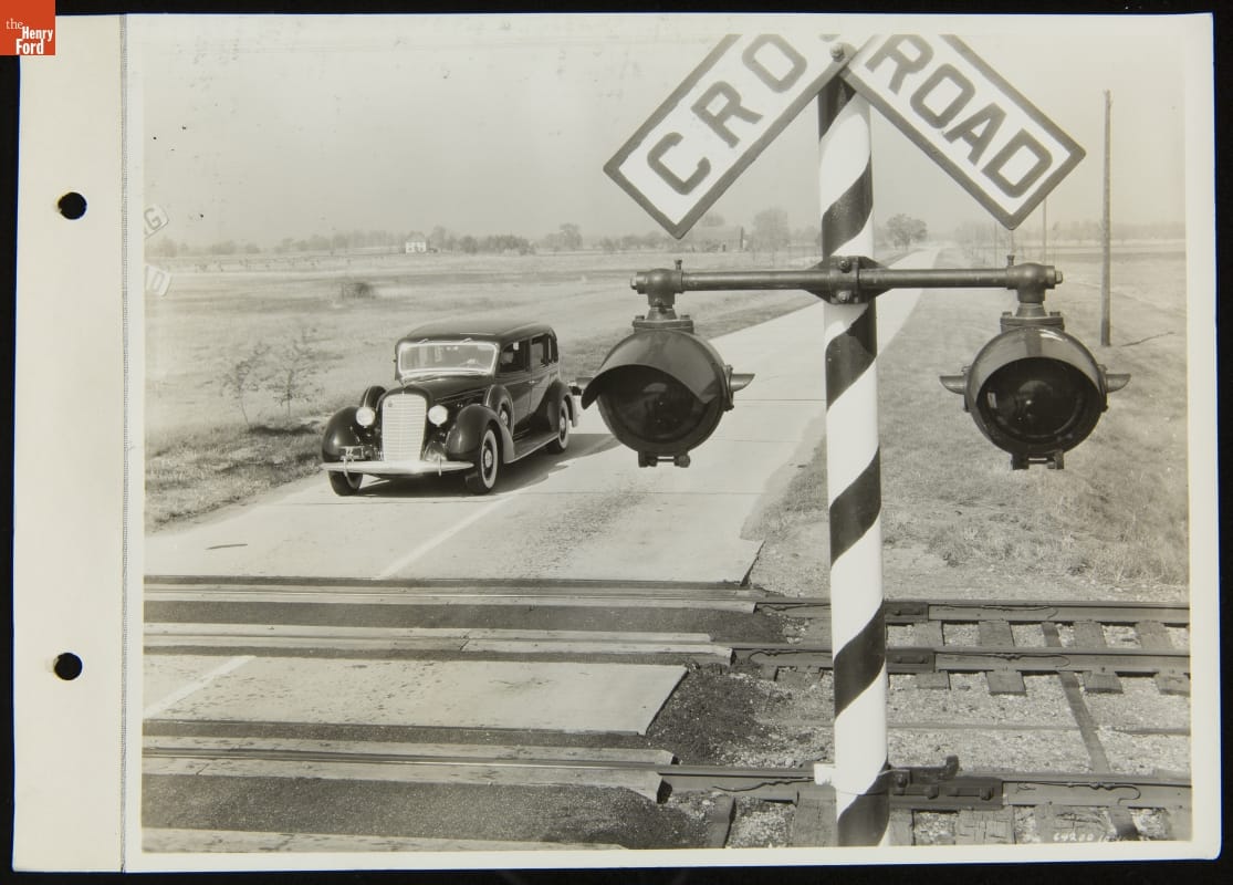 Car Stopped by Signal Light at Railroad Crossing, October 1935