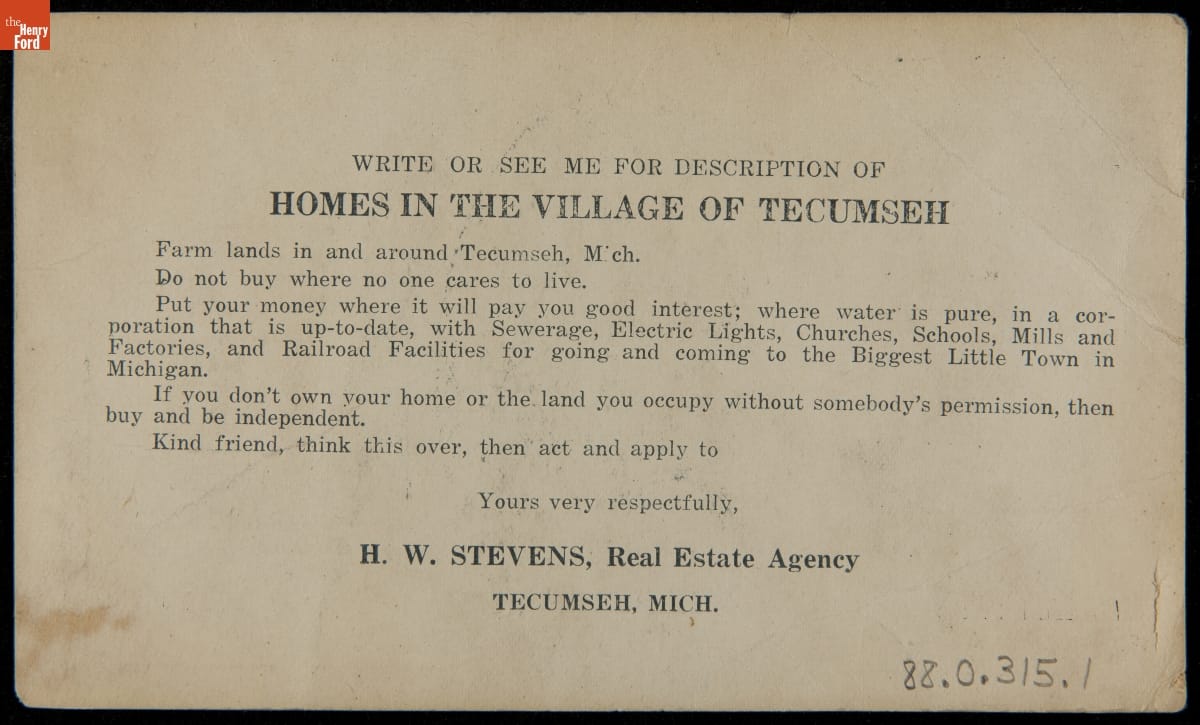 Trade Card for H. W. Stevens, Real Estate Agency, "Homes in the Village of Tecumseh," 1870-1890