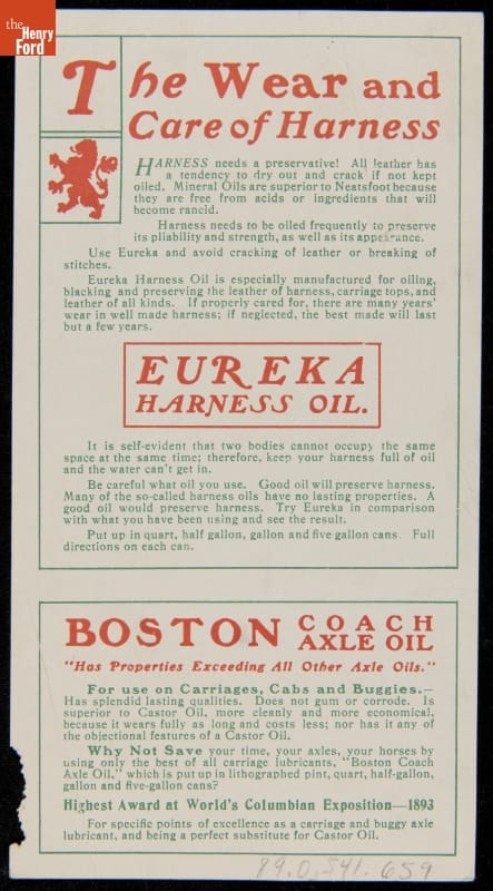 Trade Card for Eureka Harness Oil and Boston Coach Axle Oil, circa 1893