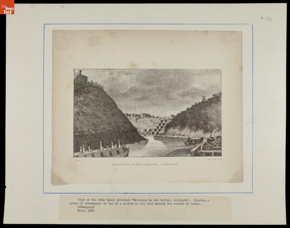 The construction of Erie Canal, connecting the Hudson River to Lake Erie, began in 1817 and completed in 1825, opened the Midwest of the United States to settlement and commerce. This print illustrates a group of passengers on top of a packet passenger boat as the boat neared the series of locks at the harbor at Lockport, New York.