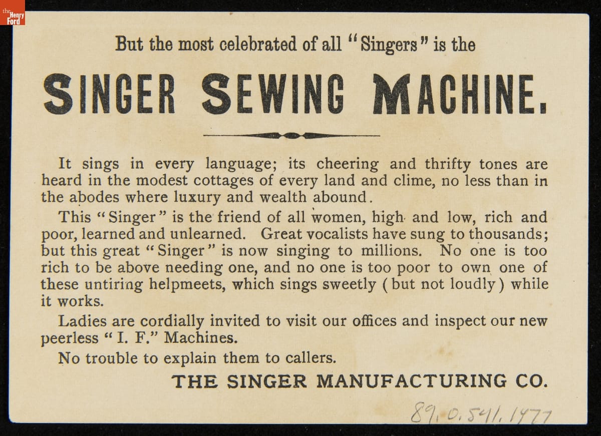 Trade Card for Singer Sewing Machines, Featuring Opera Singer Clara Louise Kellogg, 1880-1900