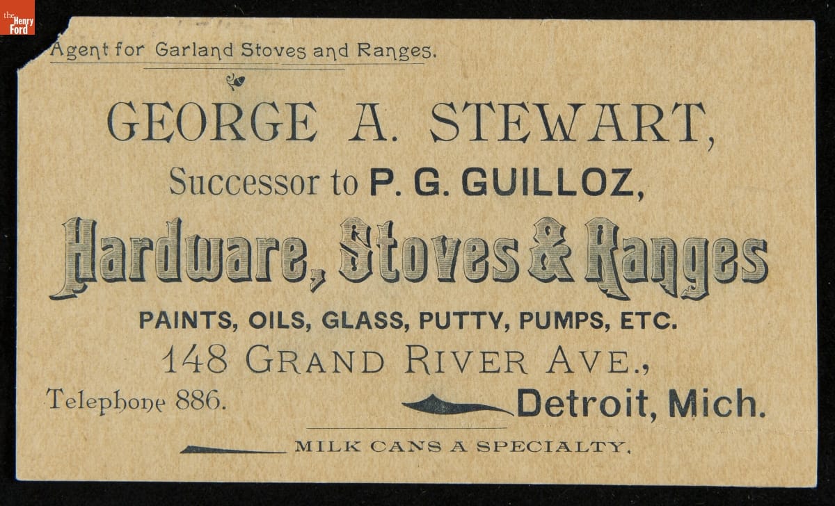 Trade Card for George A. Stewart, Seller of Hardware, Stoves and Ranges, Detroit, Michigan, 1880-1900