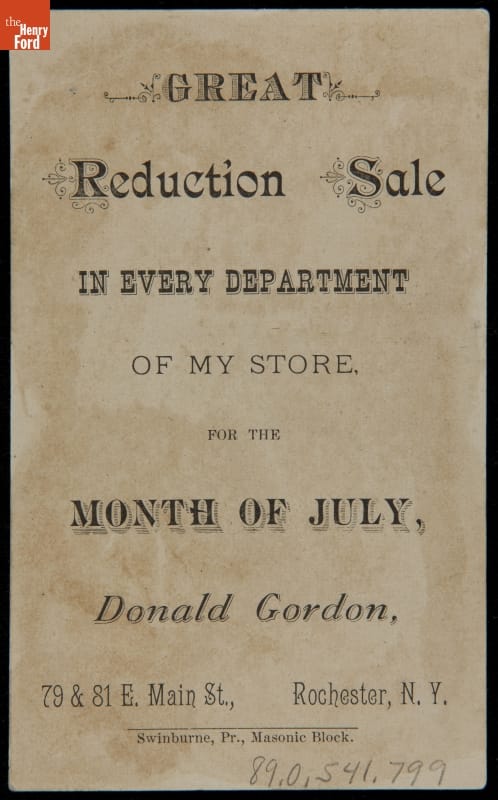 Advertised Gordon's Dry Goods & Millinery House, Rochester, New York. Card lithographed by J. H. Bufford & Sons, New York, New York