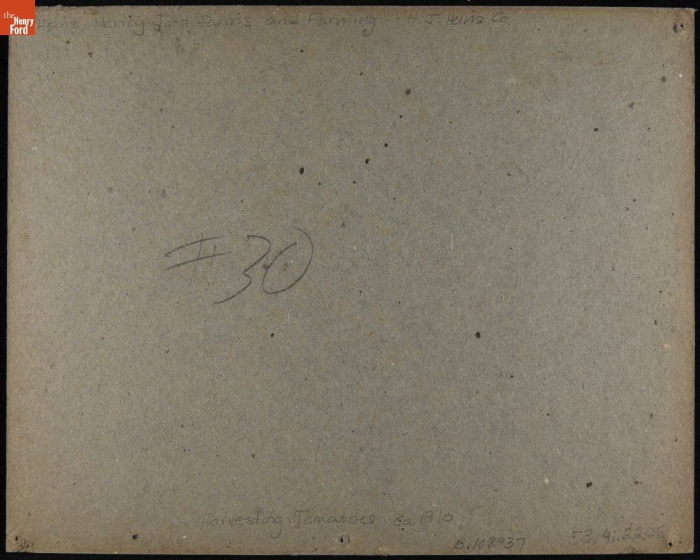 Entrepreneur H.J. Heinz recognized that producing the highest quality products began with where the ingredients were grown and how they were harvested. He took great care in managing every aspect of the process to ensure the best ingredients for his line of pickled foods, preserves, and condiments. This photograph shows one step in the tomato harvesting process.