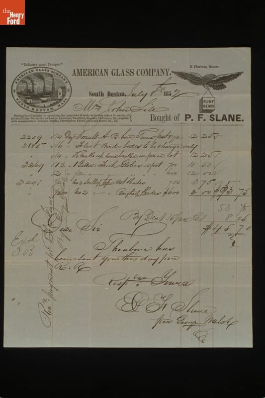 Invoice from the American Glass Company to John Sise for Glassware, July 8, 1852
