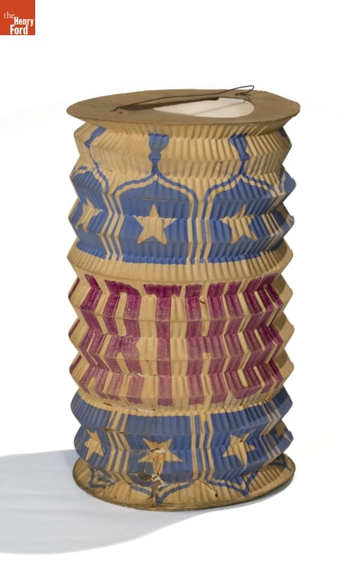 Late-nineteenth-century political parties rallied their supporters by holding torchlight parades. In the evening, marchers lit up the street carrying torches, lamps and lanterns. Inexpensive paper lanterns glowed with the image or name of the party's candidate or other patriotic imagery. Backers of the 1880 Republican presidential ticket would have carried this accordion-pleated lantern containing the names of the nominees.