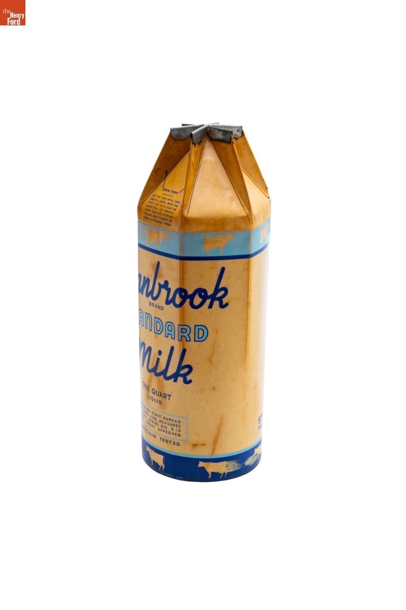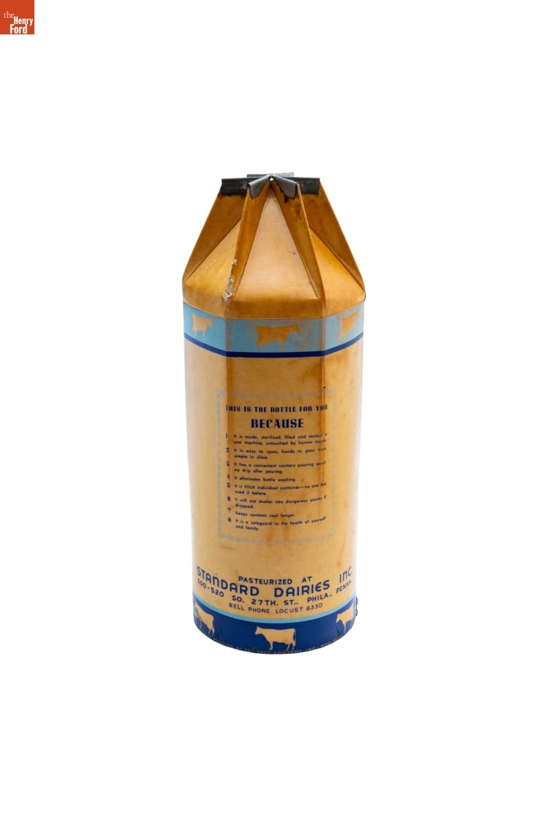 THIS IS THE BOTTLE FOR YOU / BECAUSE / 1 It is made, sterilized, filled and sealed in / one machine, untouched by human hands. / 2 It is easy to open, handy to pour from, / simple to close. / 3 It has a convenient sanitary pouring spout, / no drip after pouring. / 4 It eliminates bottle washing. / 5 It is YOUR individual container - no one has / used it before. / 6 It will not shatter into dangerous pieces if / dropped. / 7 Keeps contents cool longer. / 8 It is a safeguard to the health of yourself / and family. / PASTEURIZED AT / STANDARD DAIRIES INC. / 500-520 SO. 27TH ST., PHILA., PENNA. / BELL PHONE LOCUST 6330