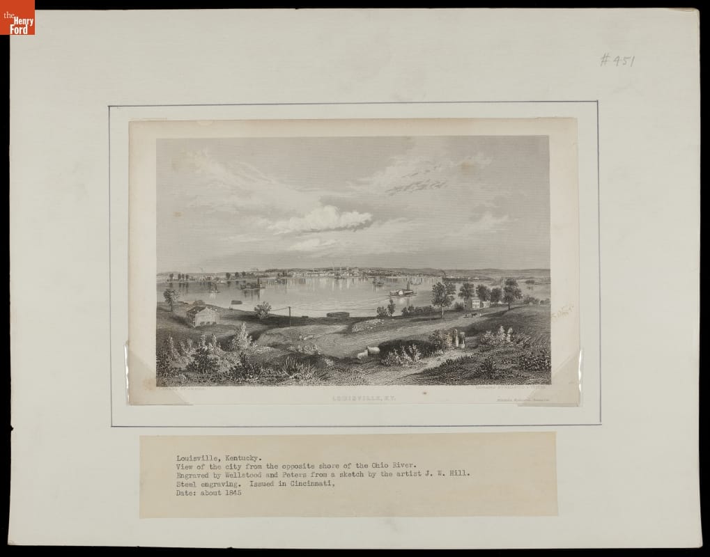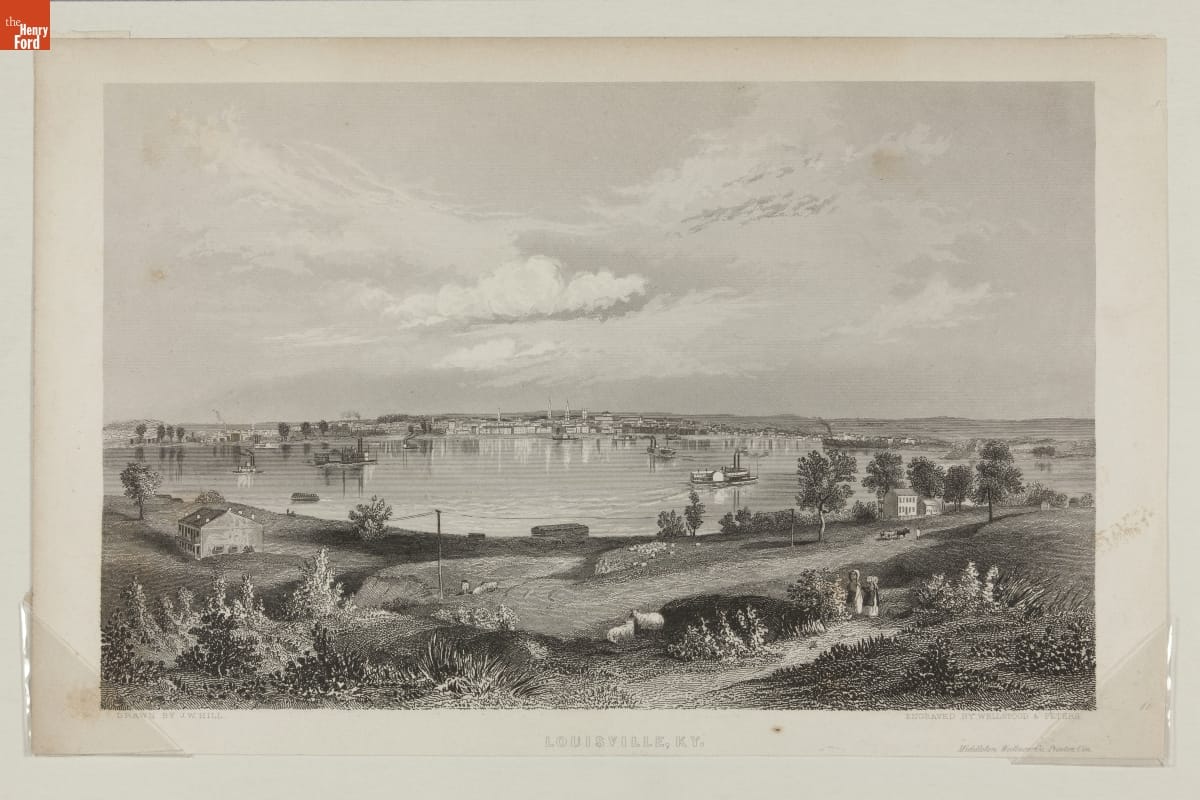 This circa 1840 steel engraving shows the city of Louisville, Kentucky, from the opposite shore of the Ohio River. Founded in 1780, Louisville grew rapidly into a major city and shipping port along the Ohio River by the 1840s.