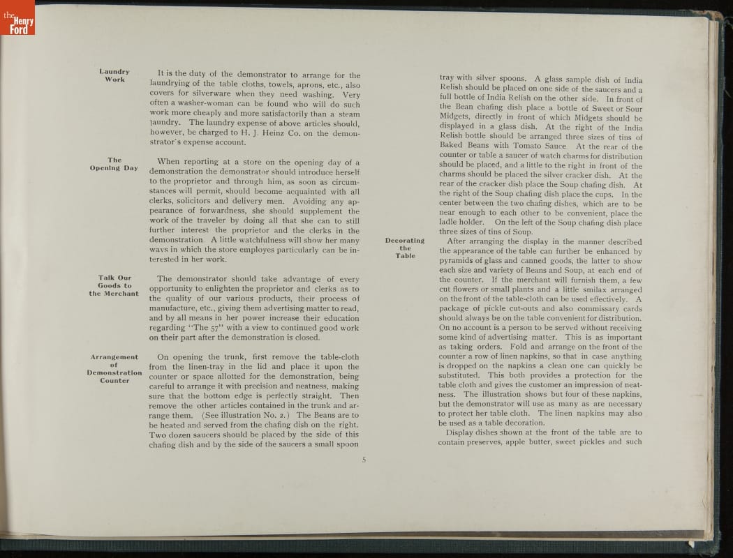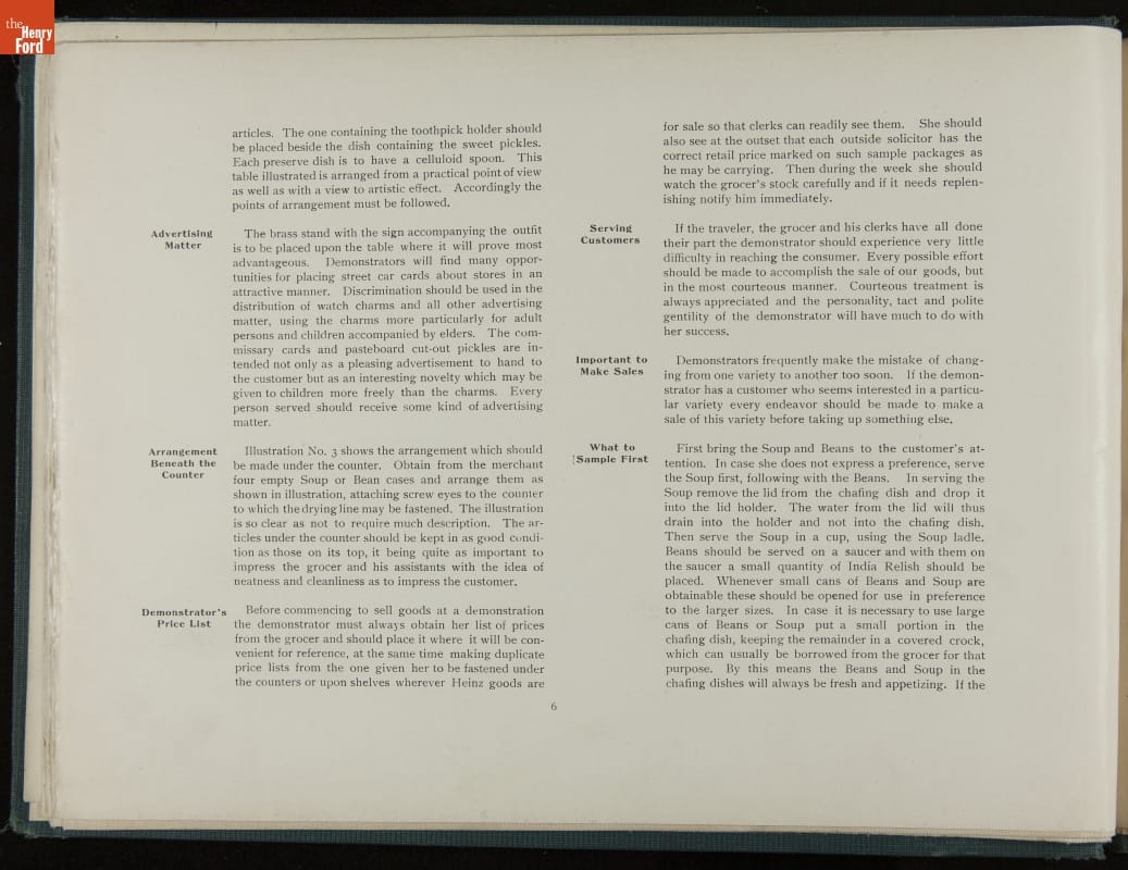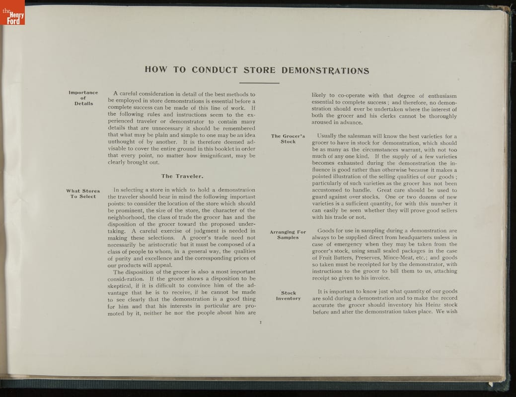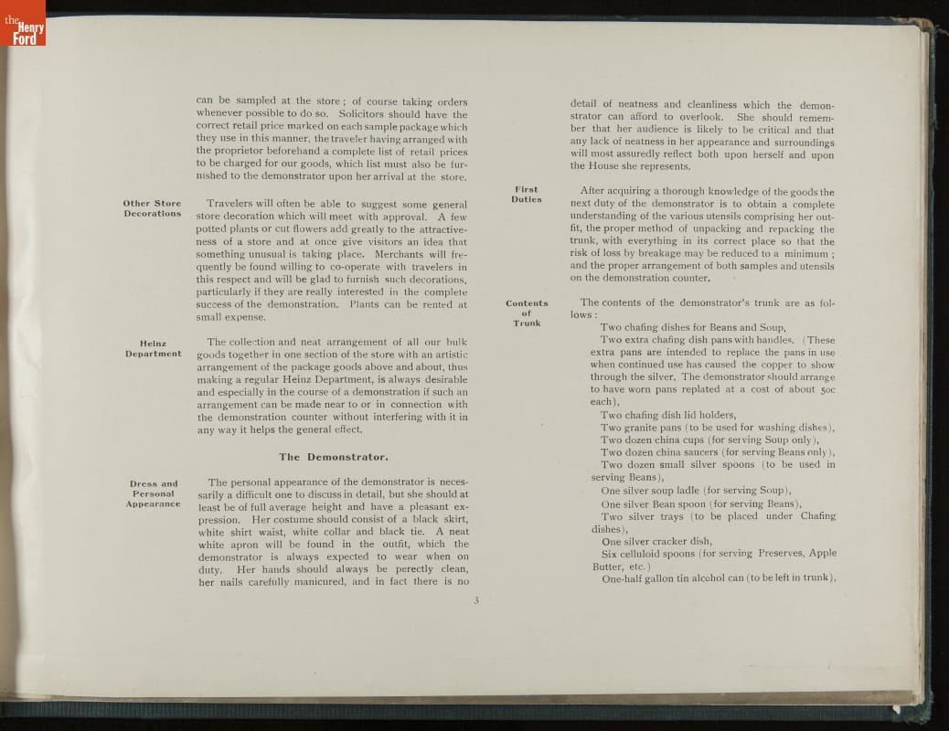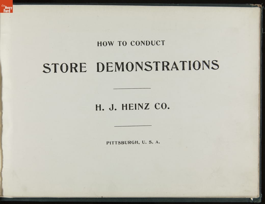 In promoting his pickled food products and condiments, H. J. Heinz was known for his attention to detail. Heinz created comprehensive training manuals for his salespeople with conversation scenarios, detailed product information, and guidelines for store displays and sampling. This demonstration book provides specific instructions for setting up and operating demonstration (sampling) tables.
