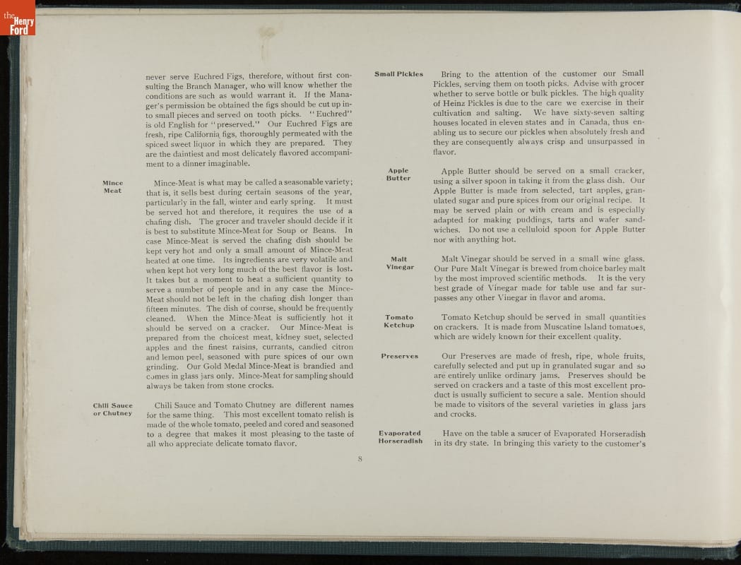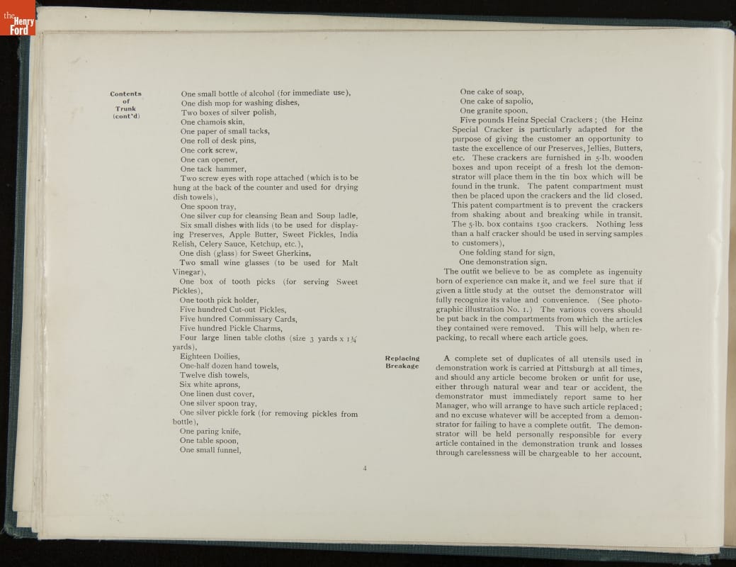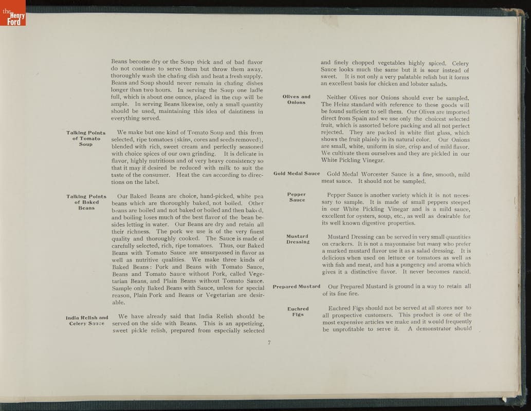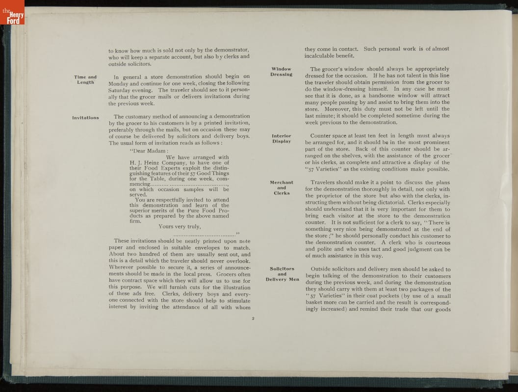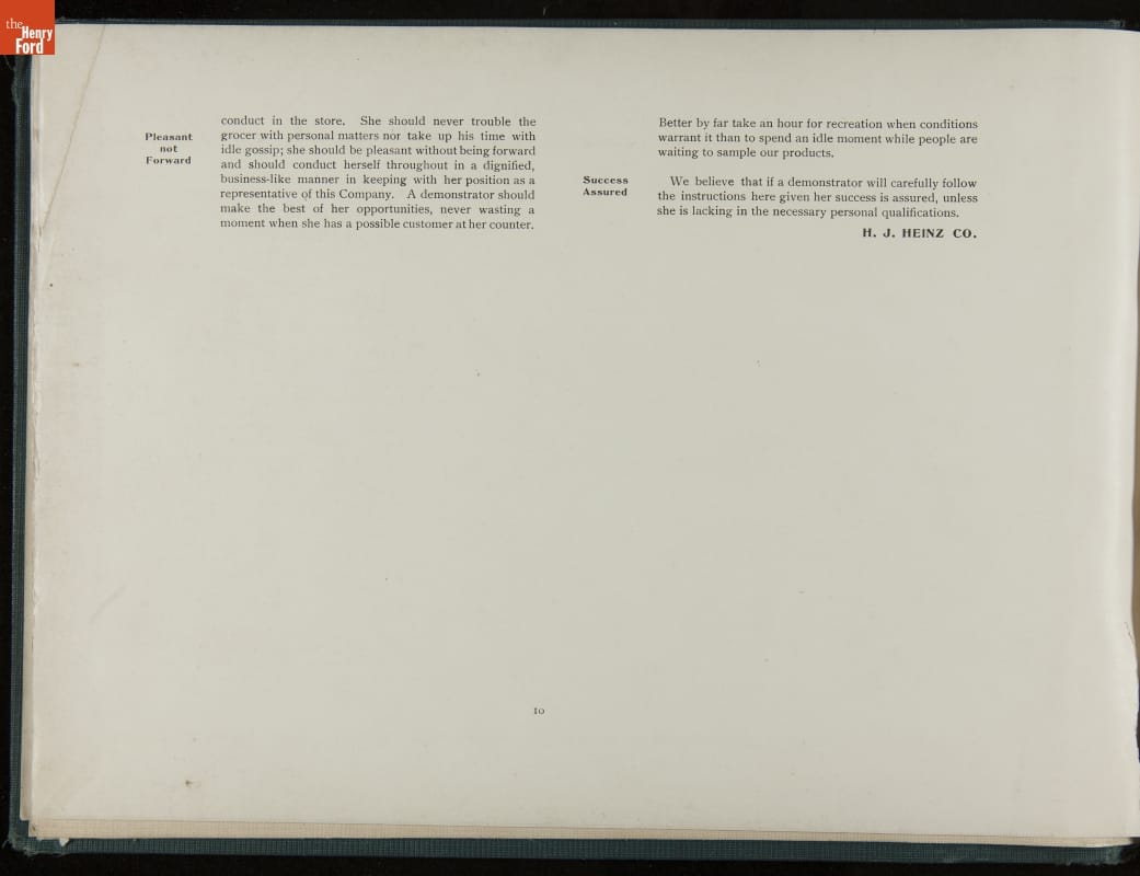 In promoting his pickled food products and condiments, H. J. Heinz was known for his attention to detail. Heinz created comprehensive training manuals for his salespeople with conversation scenarios, detailed product information, and guidelines for store displays and sampling. This demonstration book provides specific instructions for setting up and operating demonstration (sampling) tables.