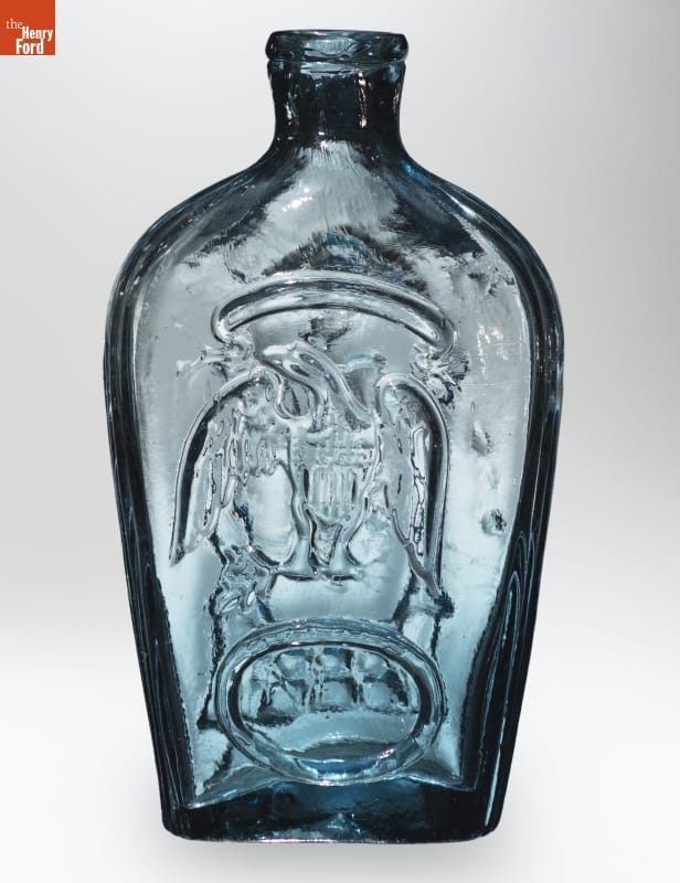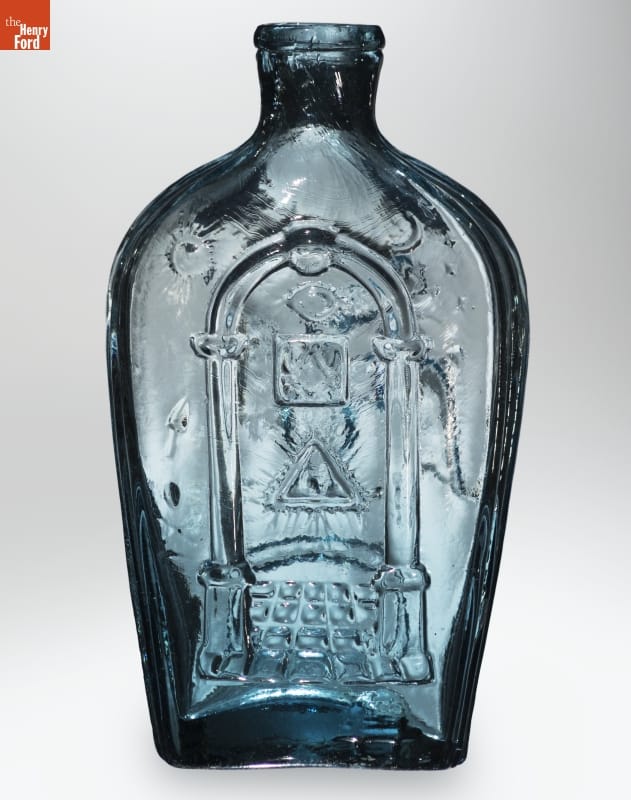 Glass factories in America began producing inexpensive, mold-formed flasks in the early 1800s. These figured flasks, often decorated with symbols of national pride or political or cultural affiliation, appealed to America's common man. Membership in the Freemasons grew in the early decades of the 1800s. Supporters of the Masonic order would recognize the ritualistic symbols on this and other similar flasks.