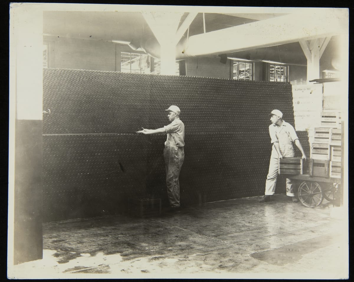 Before complete mechanization of the manufacturing process, many tasks at the Heinz factory were done by hand. The H.J. Heinz Company documented the many departments of the manufacturing process through photographs. This photograph was taken at the Bowling Green, Ohio, factory to document the year's first shipment of ketchup in 1923.