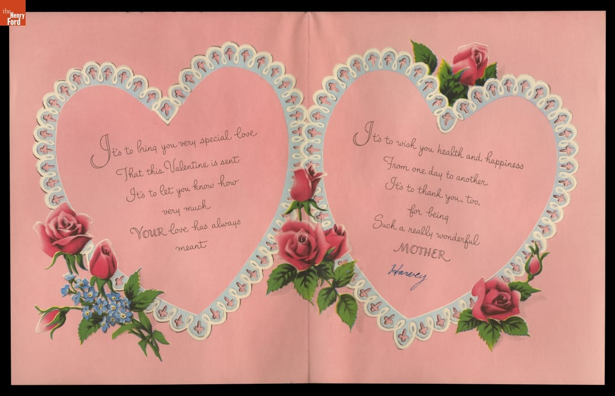 It's to bring you very special love | that this Valentine is sent | It's to let you know how | very much | YOUR love has always meant | It's to wish you health and happiness | From one day to another | It's to thank you, too, | for being such a really wonderful | MOTHER | [signed] Harvey