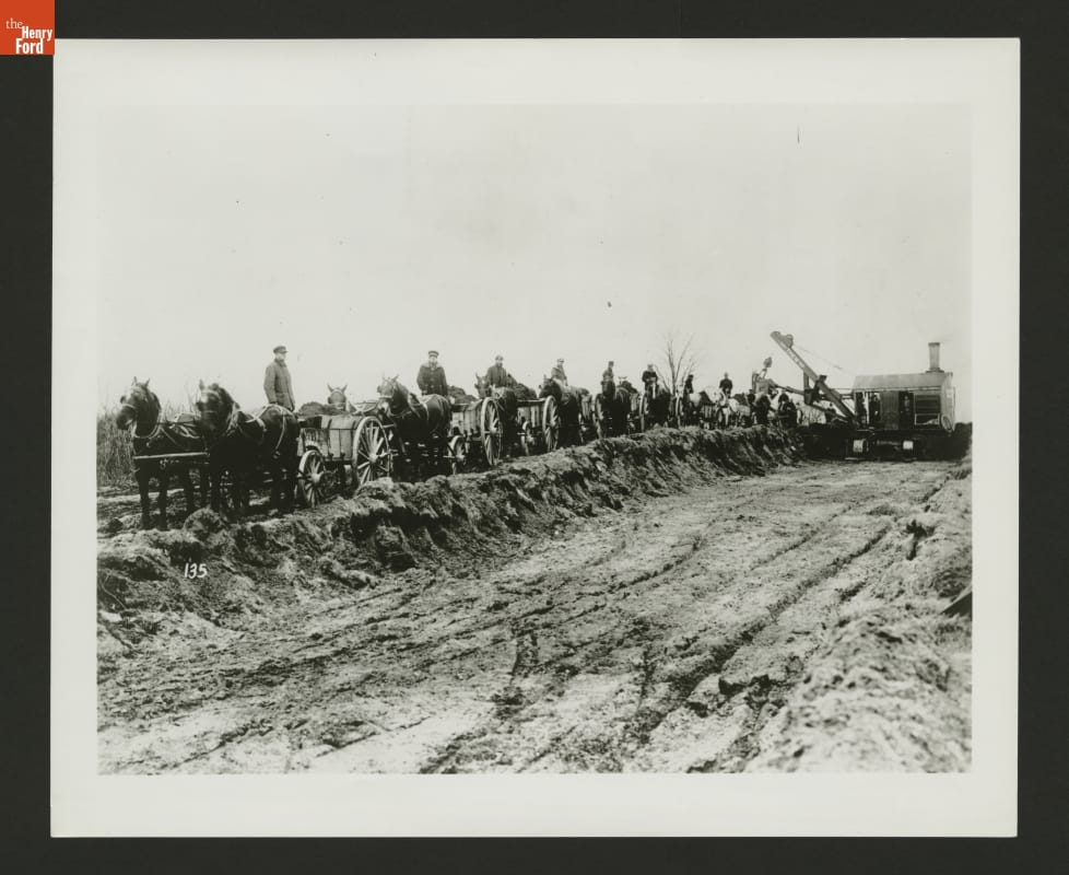 Horse-Drawn Wagons Hauling Away Dirt during Road Construction, circa 1909