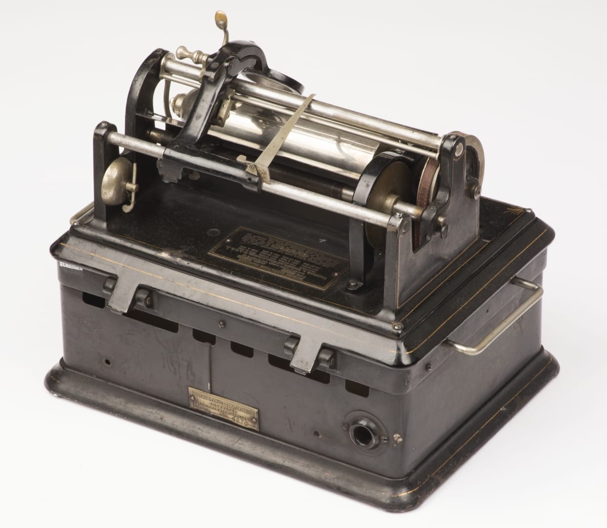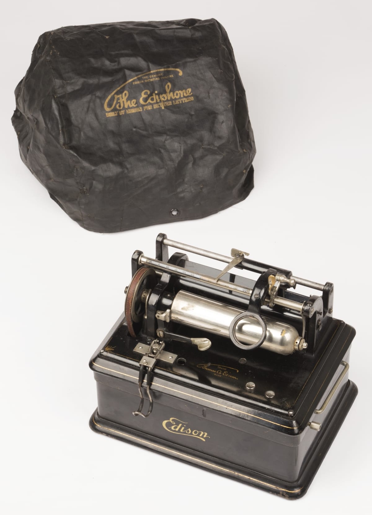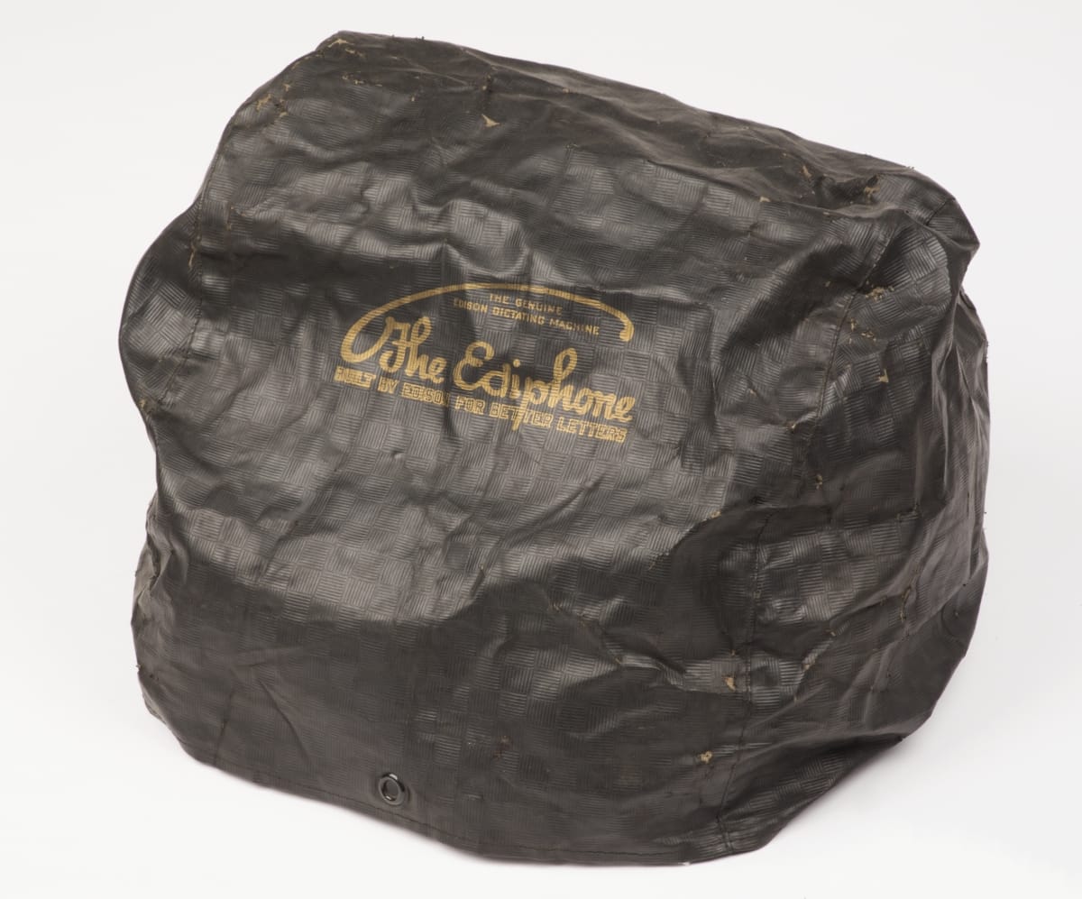 top, plaque: Edison Dictating Machine Type __ Model E Manufactured under the patents of Thomas A. Edison and Others at Orange, N.J., U.S.A. Nov. 17 1903 . . . .Nov. 8 1910 Serial No. 41376 [licensing information] top: Thomas A. Edison Trade Mark plaque, rear: Underwriters Laboratories, Inc. Inspected Motor Operated Appliance Type A No 4276 cover: The Genuine Edison Dictating Machine The Ediphone Built by Edison for Better Letters