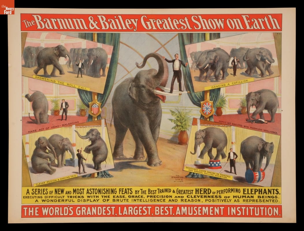 A Series of New and Most Astonishing Feats by The Best Trained & Greatest Herd of Performing ELEPHANTS. / Executing Difficult Tricks With the Ease, Grace, Precision and Cleverness of Human Beings. / A Wonderful Display of Brute Intelligence and Reason, Positively As Represented. / THE WORLD'S GRANDEST, LARGEST, BEST, AMUSEMENT INSTITUTION