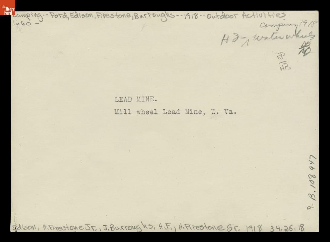 Between 1916 and 1924, Thomas Edison, John Burroughs, Henry Ford, and Harvey Firestone made a series of camping trip. On these trips they communed with nature, explored their personal interests, and acted like boys again. They called themselves Vagabonds. Here they pose with two other members of their camping party on a waterwheel at old Evans Mill near Lead Mine, West Virginia.