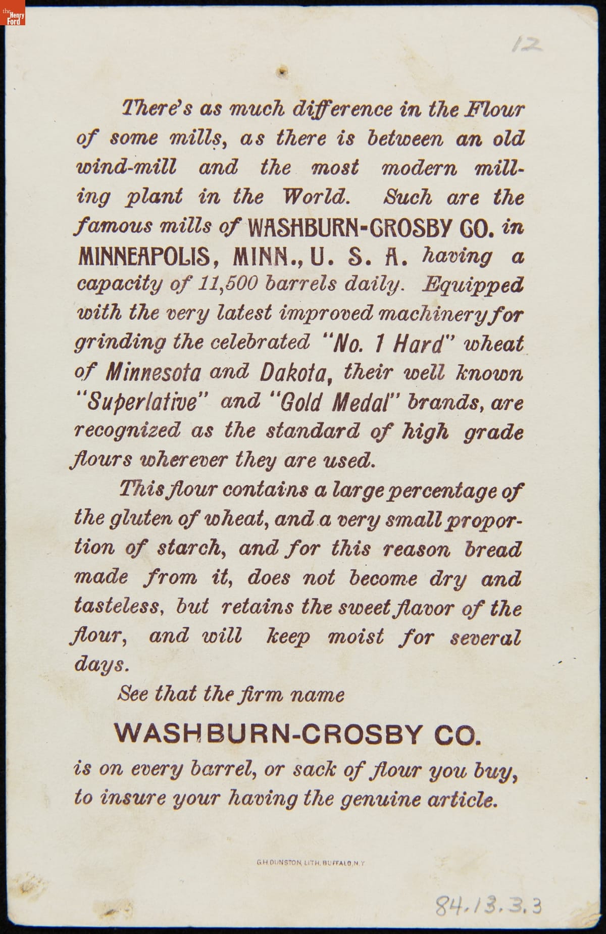 Advertised product made by Washburn-Crosby Co., Minneapolis, Minnesota. Lithography by G.H. Dunston, Buffalo, New York.