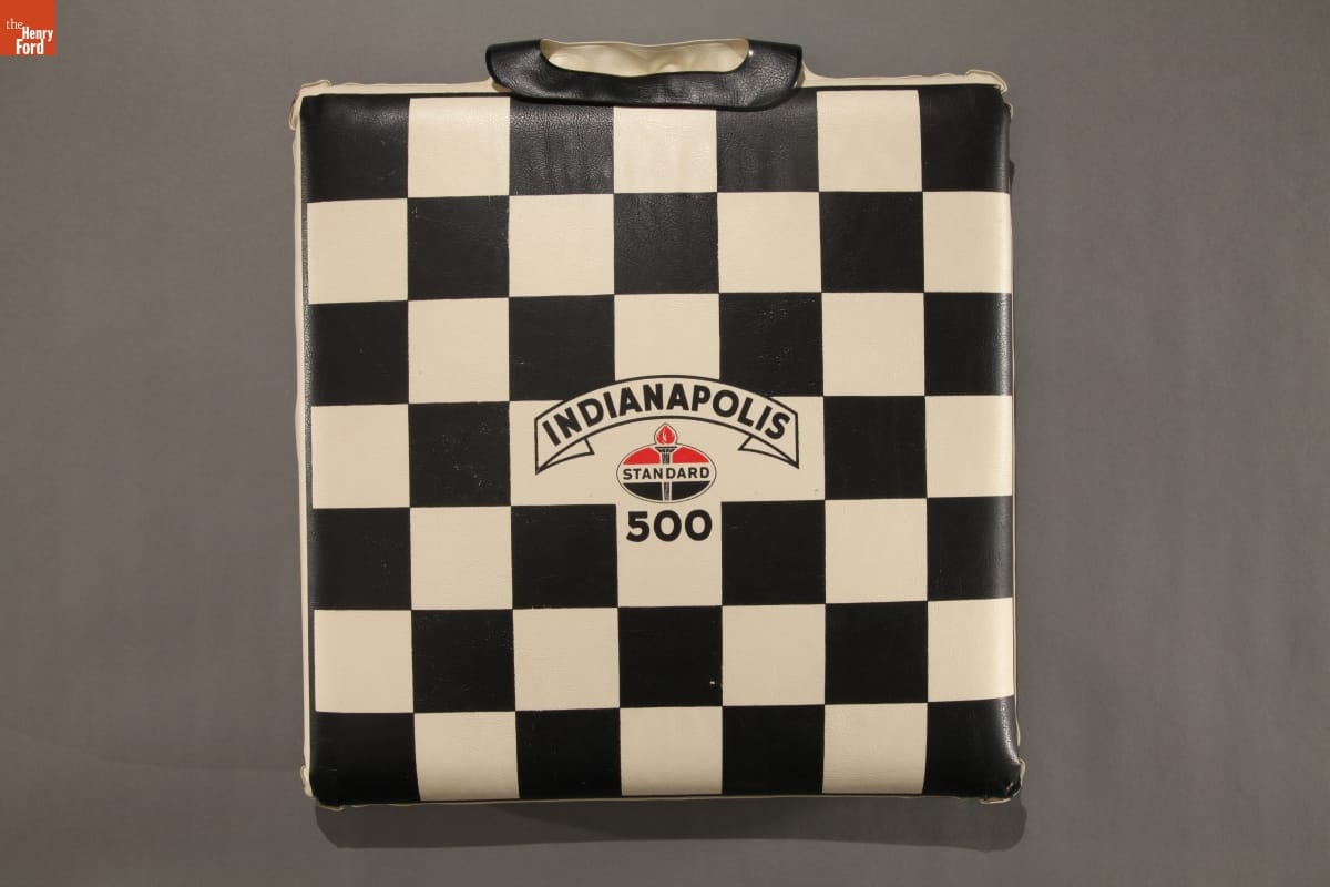 Souvenirs can provide a lifelong remembrance of places and events. Each May, Indianapolis 500 race fans have eagerly purchased souvenirs to use and take home. Checkered flag cushions, like this one from the mid twentieth century, provided a comfortable seat for fans when they were not on their feet cheering on their favorite driver.