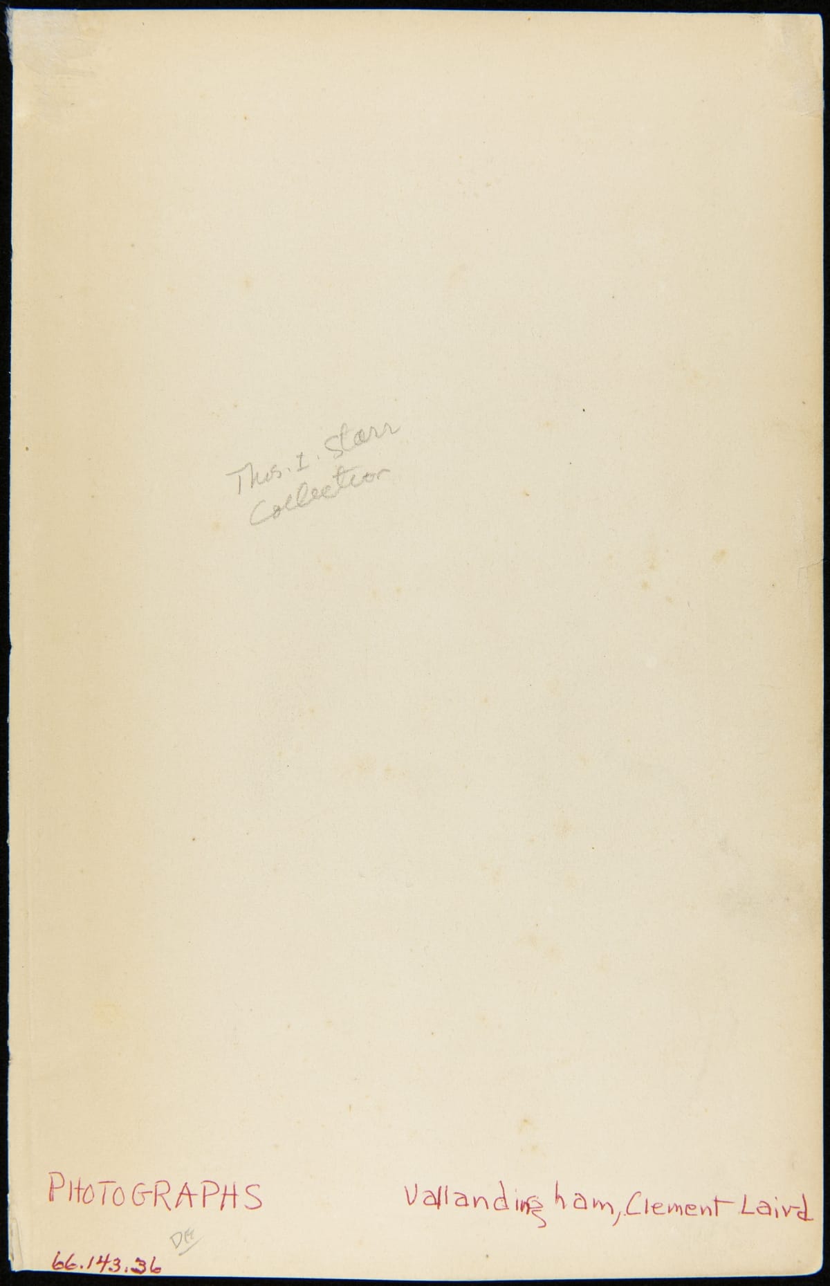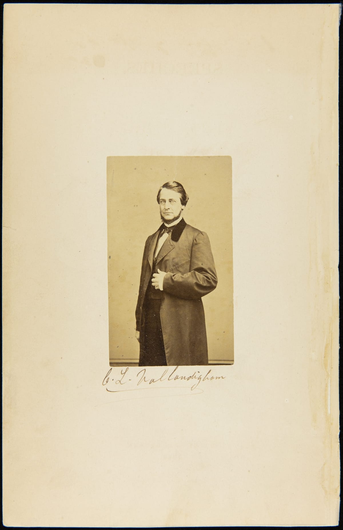 Clement Vallandigham (1820-1871), Democrat Congressman from Ohio, opposed abolition and became a leader of anti-war Democrats (Copperheads) during the Civil War. Exiled to the South in 1863 for his outspoken opposition to the war, Vallandigham traveled to Canada, where he ran for Governor of Ohio -- he lost. In 1864, Vallandigham returned to Ohio and remained active in Democratic politics until his death.